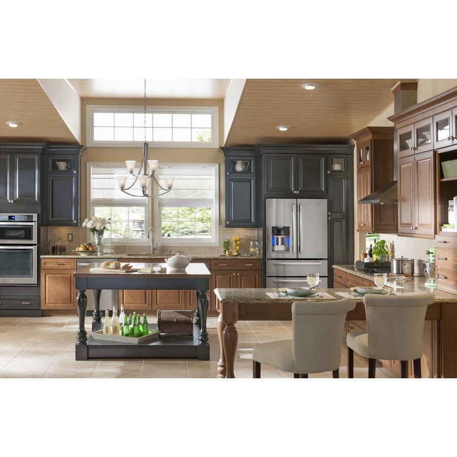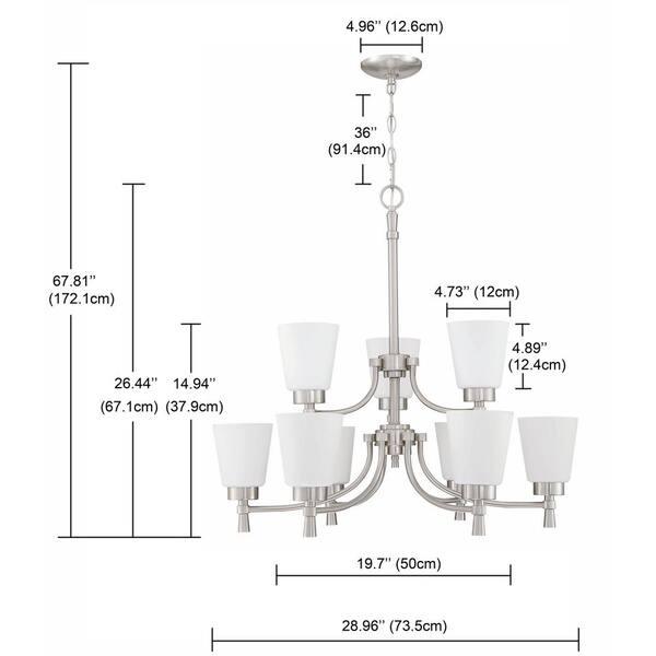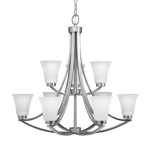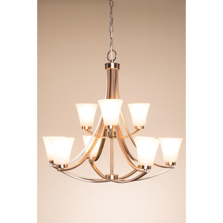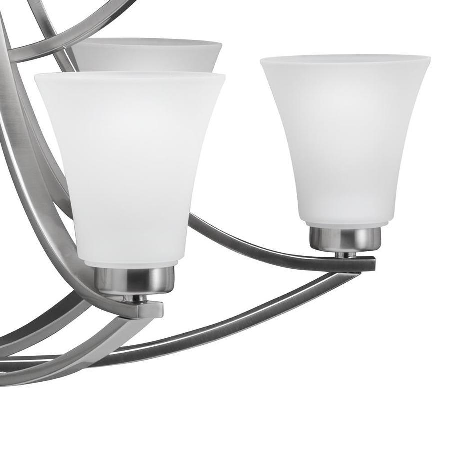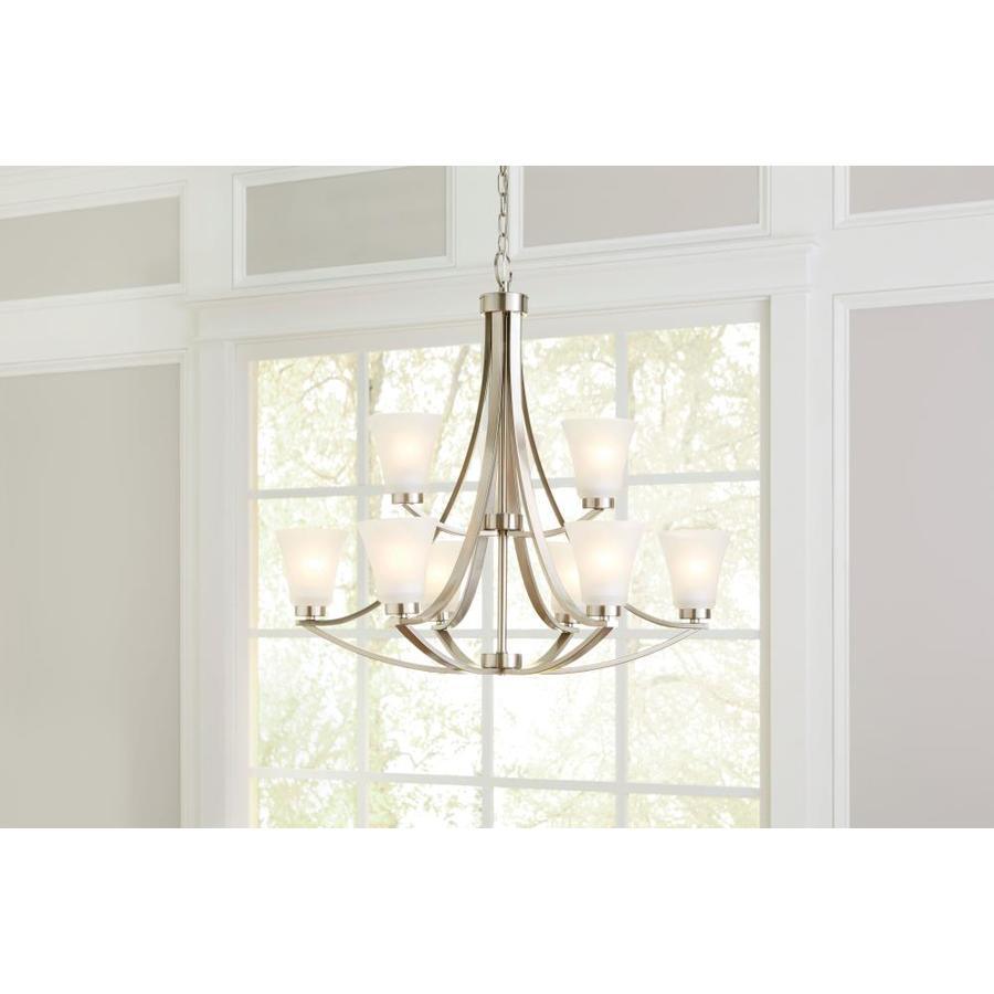 Satin nickel finish chandelier from the Lyndsay collection Etched glass shades shine a cool glow Requires nine 60-watt medium base bulbs (sold separately) Fixture dimensions: 28-in H x 30-in diameter ETL certification demonstrates that this fixture has met the minimum safety standards of a widely recognized testing organization Adjustable chain allows you to customize the hanging height Great for modern style decor Light is dimmable, so you can create your desired ambiance