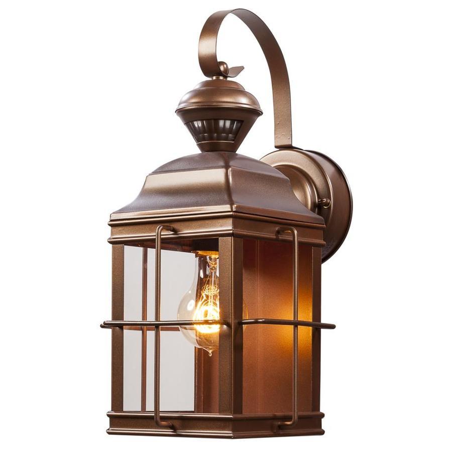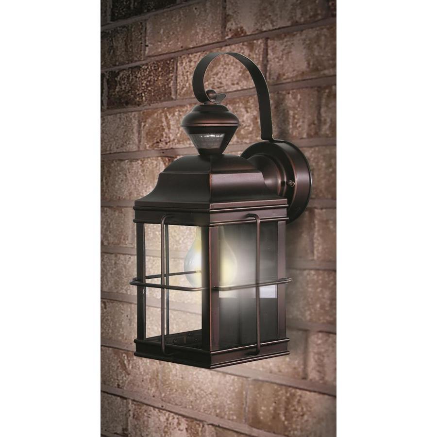 Antique bronze-finished steel fixture with flat glass is weather-resistant and sturdy 100 watt medium base incandescent Bulb required (not included) 150 ° Motion-activated sensor detects movement, automatically turning the light on 6.75-in W x 14.75-in H x 8.5-in D 2-year base warranty on the parts gives you peace of mind UL/cUL and CSA safety listing demonstrate this product has met minimum requirements of widely accepted product safety standards Hardware included for easy setup Ideal for entranceway lighting