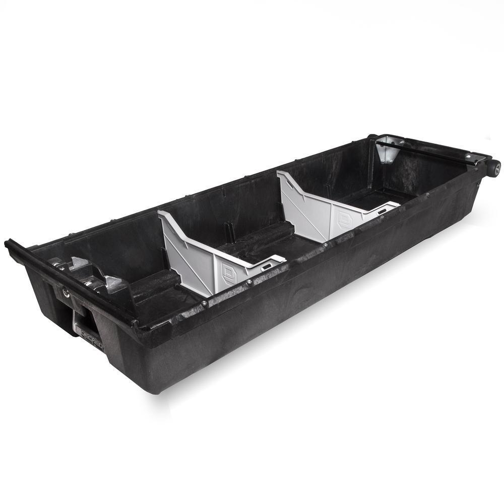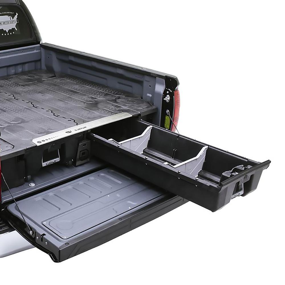 DECKED is an innovative, weatherproof truck bed storage and organization solution. 2 full bed-length drawers slide on heavy-duty wheels in steel channels to offer dry, secure storage with ergonomic access for tools, gear, guns, fishing rods and other items. Made to fit Ford, Dodge RAM, Chevy, GMC, Nissan and Toyota full sized trucks, DECKED allows full use of the pickup truck beds footprint providing organized storage under the deck. DECKED has a 2,000 lbs. payload on the deck and 200 lbs. per drawer load capacity. Further organization and customization is possible with optional drawer dividers, cargo trays, rack tie downs and locks. 100% recycled High-Density Polyethylene (HDPE) and steel. All steel hardware is finished with stainless, galvanized, or zinc chromate rust inhibitors. Covered by a 3-year warranty against product defects or failure due to workmanship. Note: drawers are not water or airtight, some fine particulate matter such as dust and water vapor may enter. Assembly and installation time approximately 2-hours. Removal/reinstall time approximately 15-minutes to 20-minutes. Tools necessary: adjustable wrench, Philips screwdriver, 1/2 in. and 7/16 in. open wrenches, Pliers, 3/8 in. socket and 7/32 in. hex wrench. Some vehicles require additionally: 10 mm socket, T30 or T40 Torx driver.