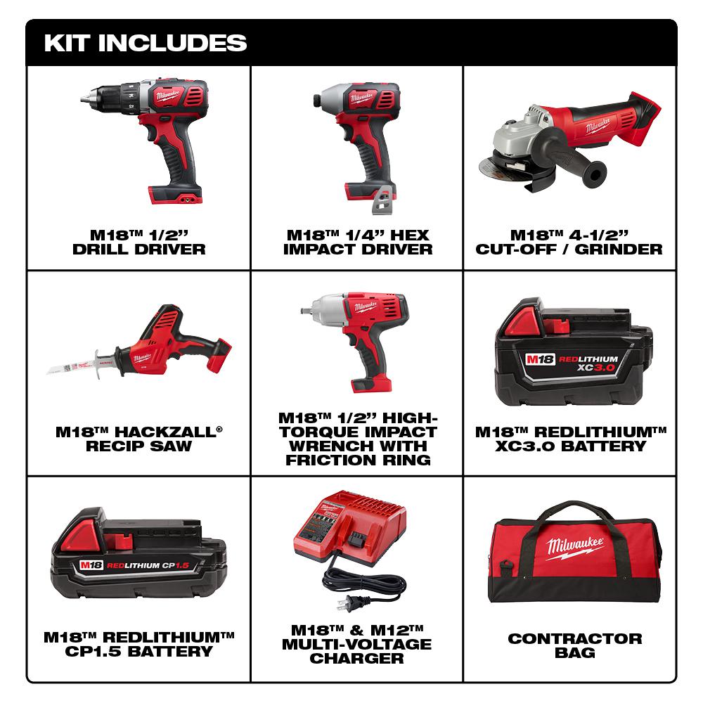 The MILWAUKEE M18 5 Tool Combo Kit includes an M18 Compact 1/2 in. Drill Driver, M18 1/4 in. Hex Impact Driver, M18 Cordless 4-1/2 in. Cut-Off Grinder, M18 HACKZALL Recip Saw, M18 1/2 in. High Torque Impact Wrench with Friction Ring, M18 REDLITHIUM XC Extended Capacity Battery, M18 Compact REDLITHIUM Battery and an M18 and M12 Multi-Voltage Charger. The M18 Compact 1/2 in. Drill Driver is the most compact in its class with a 4-pole frameless motor that delivers 500 in. lbs. of torque and up to 1,800 RPM. The M18 1/4 in. Hex Impact Driver offers the best power to size ratio, delivering up to 2,750 RPM, 3,450 IPM and 1,500 in. lbs. of fastening torque. The M18 Cordless 4-1/2 in. Cut-Off / Grinder features the user-preferred paddle switch for comfort and easy use in various positions. The M18 HACKZALL Recip Saw is designed for one-handed use with dual gear anti-vibration system to provide unmatched comfort and control. The M18 1/2 in. High Torque Impact Wrench with Friction Ring is the most powerful, most compact and longest-running wrench, delivering up to 450 foot lbs. of torque. Milwaukee extended capacity and compact batteries feature REDLINK Intelligence for optimized performance and the Multi-Voltage charger sequentially charges M12 and M18 battery packs.
