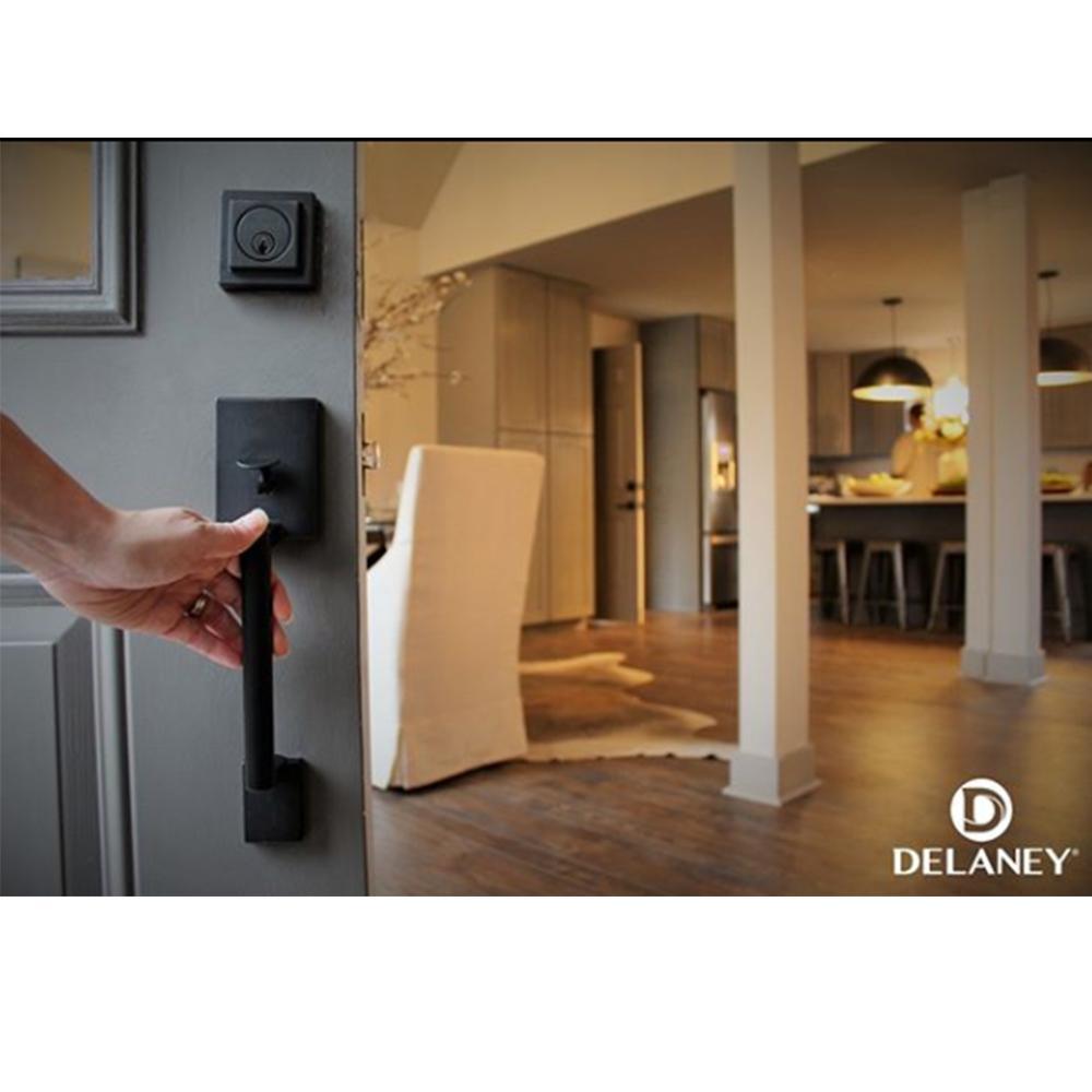 Clean, modern and contemporary. The Delaney Avino Tuscany Bronze square design entry door handle set is a simplistic yet elegant style to complement a wide selection of home designs. The upper trim is a single cylinder deadbolt which can be locked or unlocked with a key on the outside or with the thumb turn on the inside. Meets egress codes. The inside lower trim is a matching Tuscany Bronze finish universal round knob that works on right hand or left hand swing doors. Split trim design accommodates installations for either new construction or replacement/remodeling.