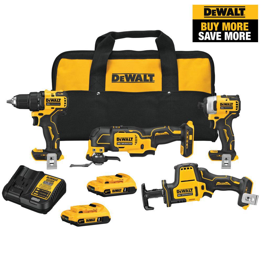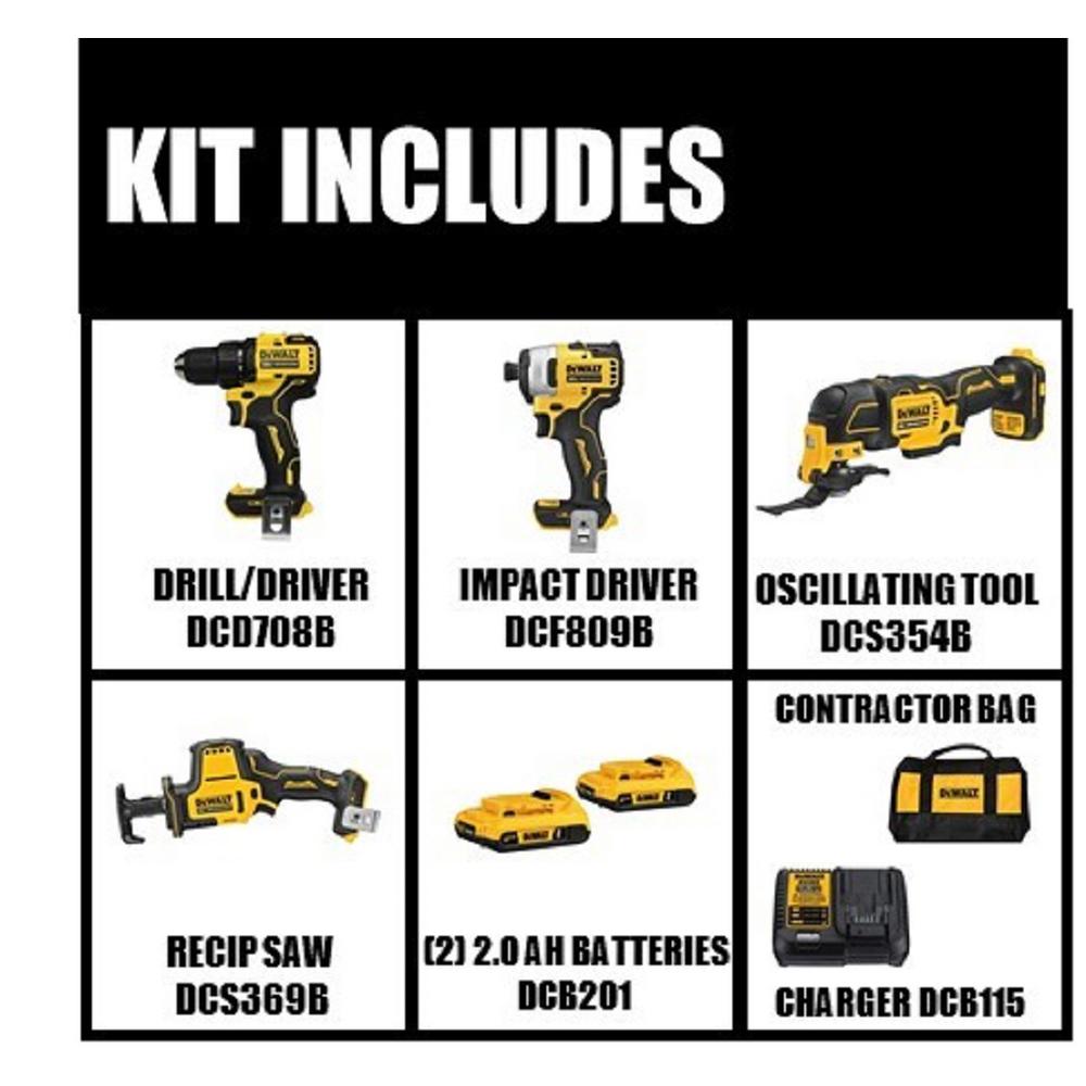 This ATOMIC Compact Series™ 20V MAX* Cordless Combo Kit includes one 1/2 in. Drill/Driver, 1/4 in. Impact Driver, One-Handed Reciprocating Saw, Oscillating Multi-Tool, charger, kit bag, and two 20V MAX* 2.0Ah batteries. The DCD708 Drill/Driver is compact at only 6.3 in. front to back, and its high-performance brushless motor delivers 340 unit watts out (UWO). The DCF809 Impact Driver features a high-performance brushless motor that delivers 1,700 in-lb of max torque. The DCS354 Oscillating Multi-Tool has a DUAL-GRIP™ variable-speed trigger that provides increased speed and application control. The DCS369 One-Handed Reciprocating Saw is lightweight at only 3.13 lbs., making it 37% lighter than the DCS367 Compact Reciprocating Saw (Tool Only).