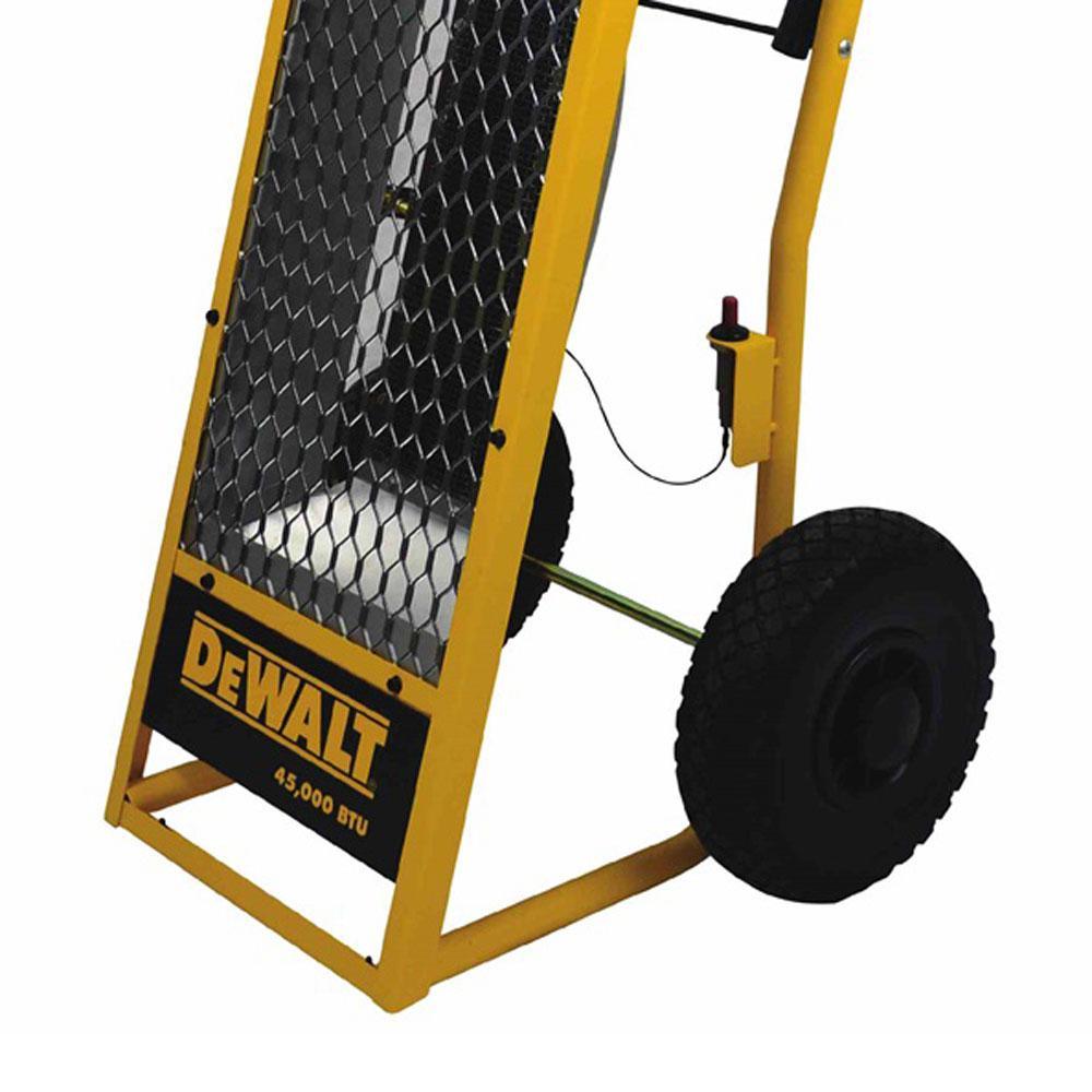 From the construction site to the garage, from the barn to the job site and from the workshop and beyond, you can stay warm with the DEWALT 45,000 BTU Radiant Propane Portable Job Site Heater. Fueled with up to a standard 20 lbs. propane tank with hose and hookup included, this heater features a heat output of 45,000 BTUs from its 20 in. x 5 in. quiet, steel mesh radiant burner. It also features a thermo electric safety valve, folding handles and durable steel frame. With the durable, 10 in. tires, you can wheel the DEWALT 45,000 BTU Radiant Propane Portable Job Site Heater anywhere on the job site so you and your crew can always keep the cold at bay.
