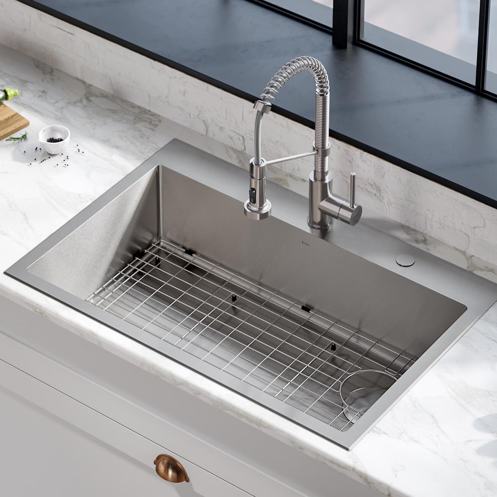 • Included with purchase: sink, dishwasher-safe bottom grid, drain assembly with strainer, removable drain cap, soap dispenser hole cap, mounting hardware, cut out template
