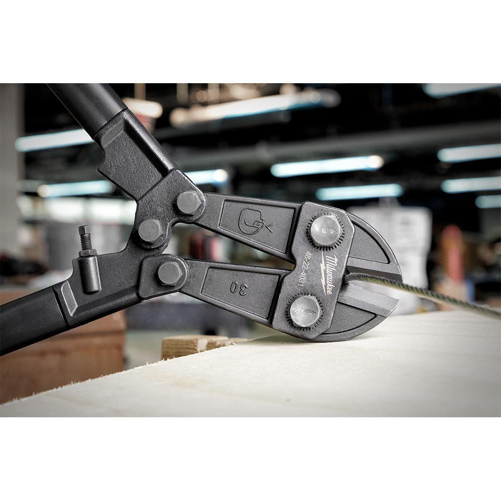 The Milwaukee 30 in. Bolt Cutter features optimized Forged Steel Blades custom heat-treated to provide maximum durability. Bolt Lock secures the pivot bolts to prevent loosening. The bolt cutter handles feature Milwaukee comfort grip that won't peel or slide off. The 14 in. bolt cutter has adjustable blades and integrated lanyard holes in the handles for easy tethering.