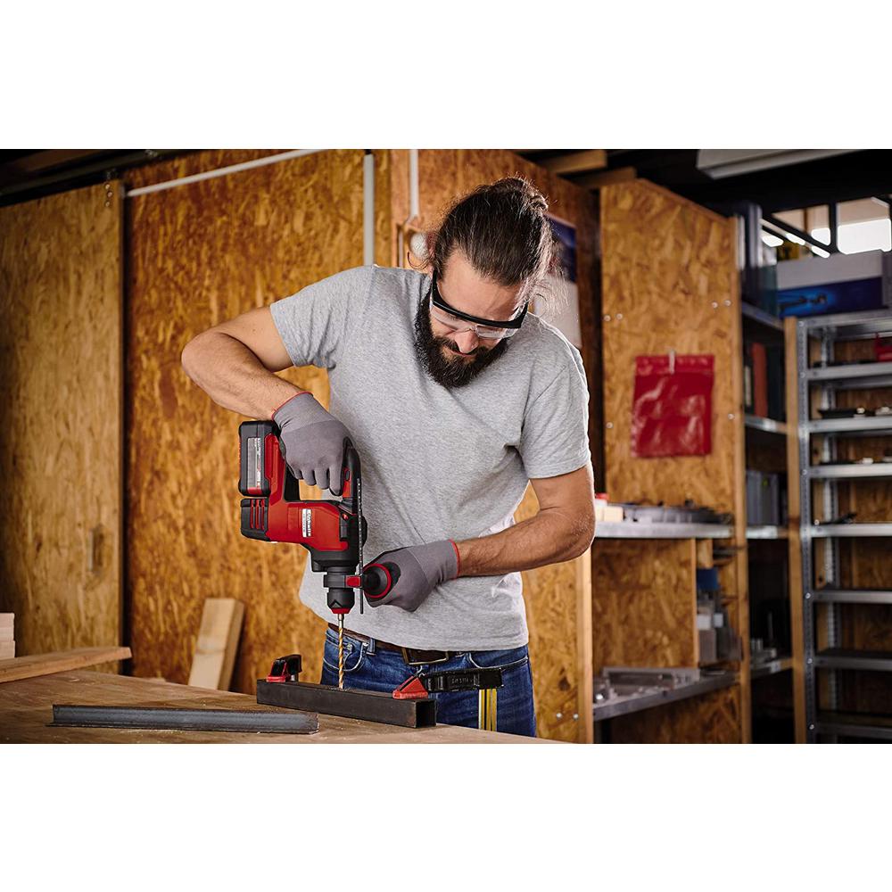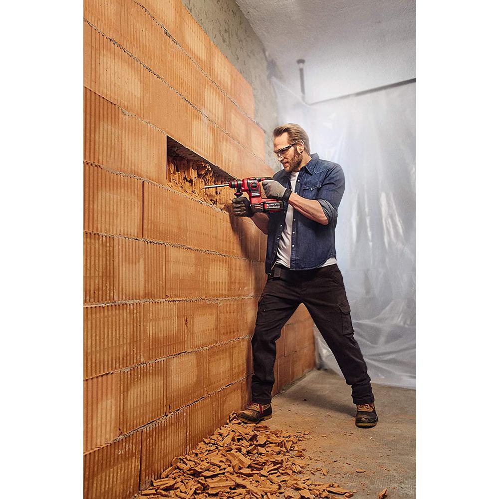 The Einhell cordless rotary hammer Herocco is a reliable performer: for drilling, impact drilling or chiseling with or without lock, the cordless rotary hammer is a valued all around rotary hammer. The brushless motor delivers more power and provides longer operation. Designed as a member of the Power X-Change family, all the rechargeable batteries in the system series can be used flexibly and without restriction in the workshop, home and garden. The pneumatic impact mechanism, which has a frequency of up to 5,500 impacts per minute, makes effortless work of drilling even into concrete - with an impact power of 2.2 joules and a drilling capacity in concrete of 3/4 in. Tools can be changed quickly with the universal SDS-plus tool chuck with auto-slip-in function. The speed electronics are finely adjustable for sensitive operation. For comfortable and tireless operation the grip area is ergonomically designed and has a soft grip. The LED light provides optimum illumination for the work area. The product is supplied with a magnetic bit adapter and transport/storage case E-Box. The batteries and charger are available separately. For optimum operation it is recommended to use a 3.0 Ah battery or higher.