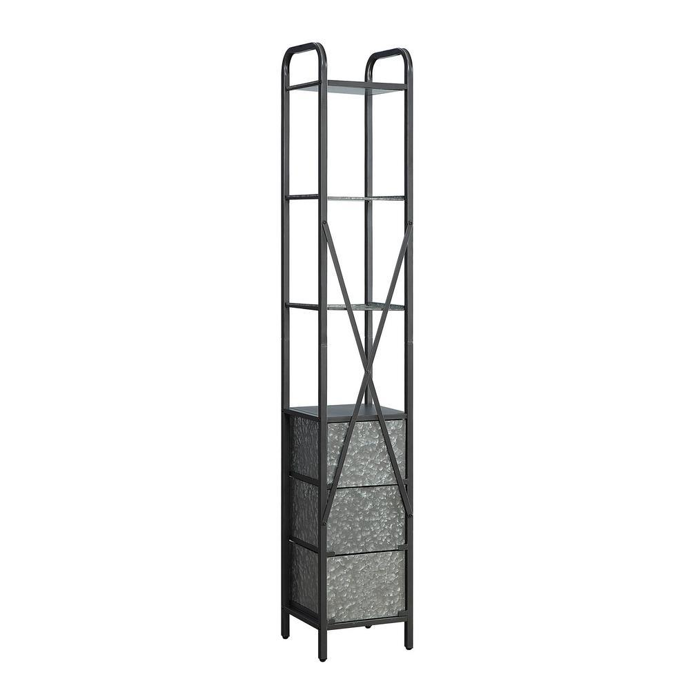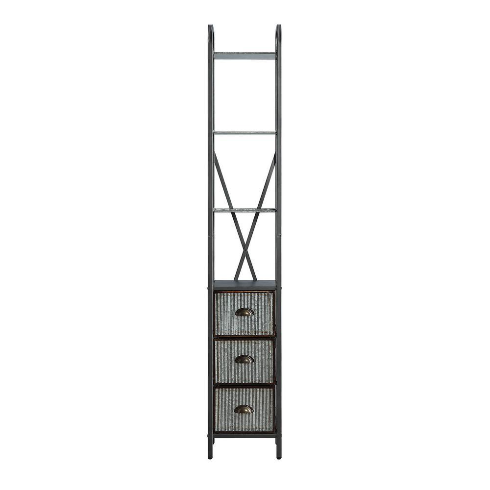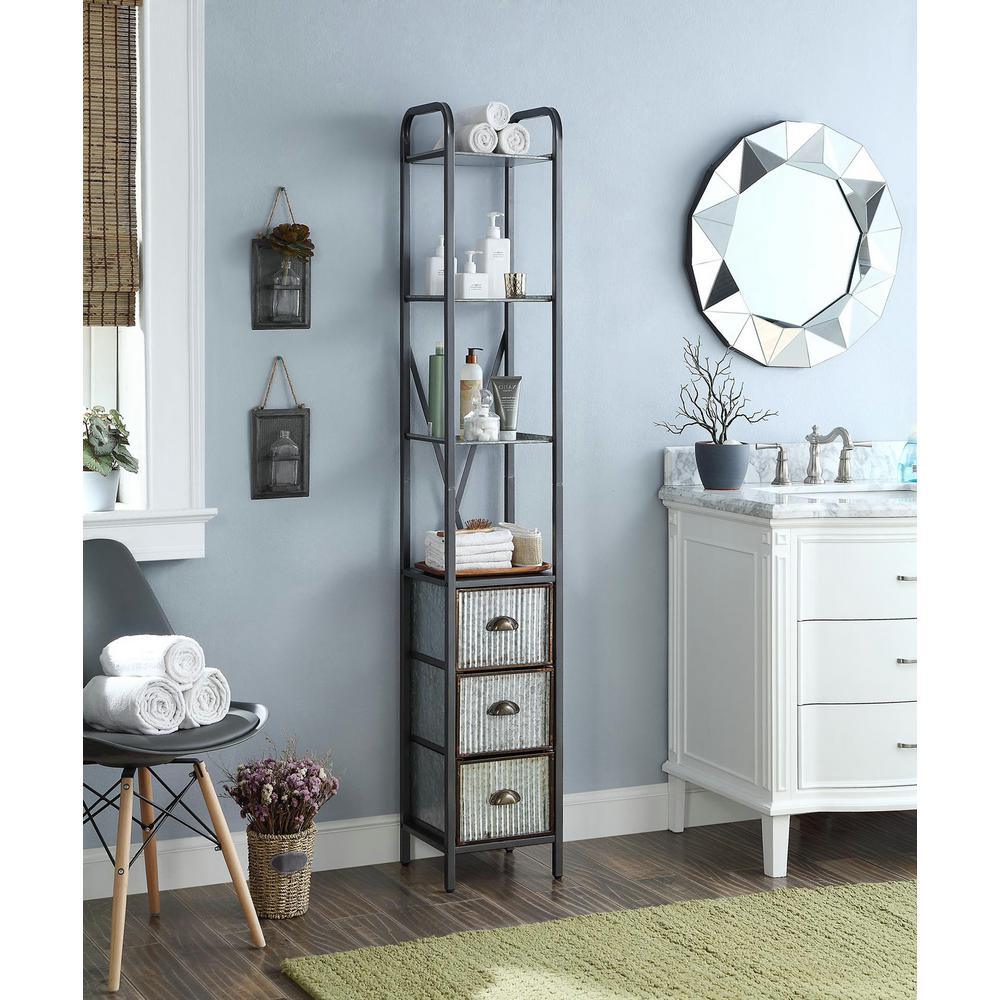 The Montclair Space Saver Collection Tower is a wonderful storage space saving unit for your bathroom. Finished in galvanized metal, the rustic storage tower will give your bathroom a high end design. Designed with two metal shelves and three corrugated metal drawers, this unit is ideal for washcloths, bathroom accessories, knickknacks and any other storage needs. This easy to clean item is a great choice for your bathroom or any other room in your home. The metal is finished with a powder coated system that makes it resistant to many of the harsh elements in the bathroom. Goes great with The Montclair Space Saver Collection Cabinets. Clean with a dry non-abrasive cloth. Assembly required.