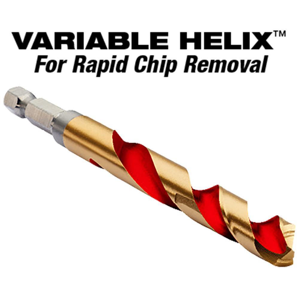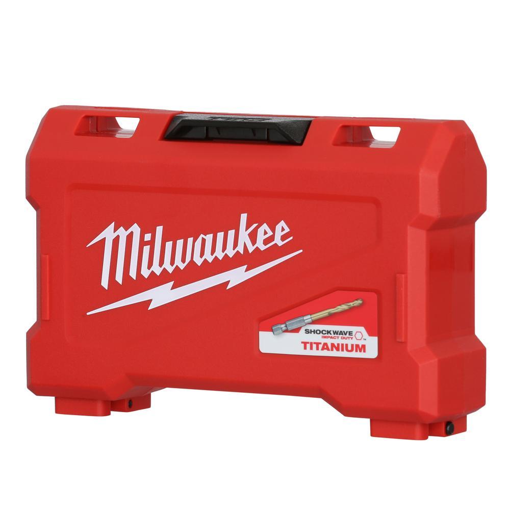 The Milwaukee 22-piece SHOCKWAVE Impact Duty Titanium Drill and Carbide Hammer Drill Bit Set with Red Helix are engineered for impacts drivers and drills. The drill bits are designed with Variable Helix featuring an aggressive 35° Helix Angle ending at 15°. This allows for Rapid Chip Removal, limiting heat buildup to stay sharper longer. The 135° split point drill bit tip delivers a precision start and prevents walking for fast, accurate holes. The titanium coated bits can be used in all drilling applications giving up to 3X life vs. Black Oxide drill bits. Carbide Hammer Drill Bit Kit uses sharpened carbide to deliver up to 5x longer life in concrete and up to 2x faster drilling into masonry materials. Engineered with a precision ground tip, these bits deliver faster starts and less walking in concrete, brick and block. The wide flutes allow for fast dust removal. Equipped with a 1/4 in. Hex Shank, Milwaukee SHOCKWAVE Carbide Hammer Drill Bits are the ideal solution for drilling in masonry materials with both impacts and hammer drills/drivers.