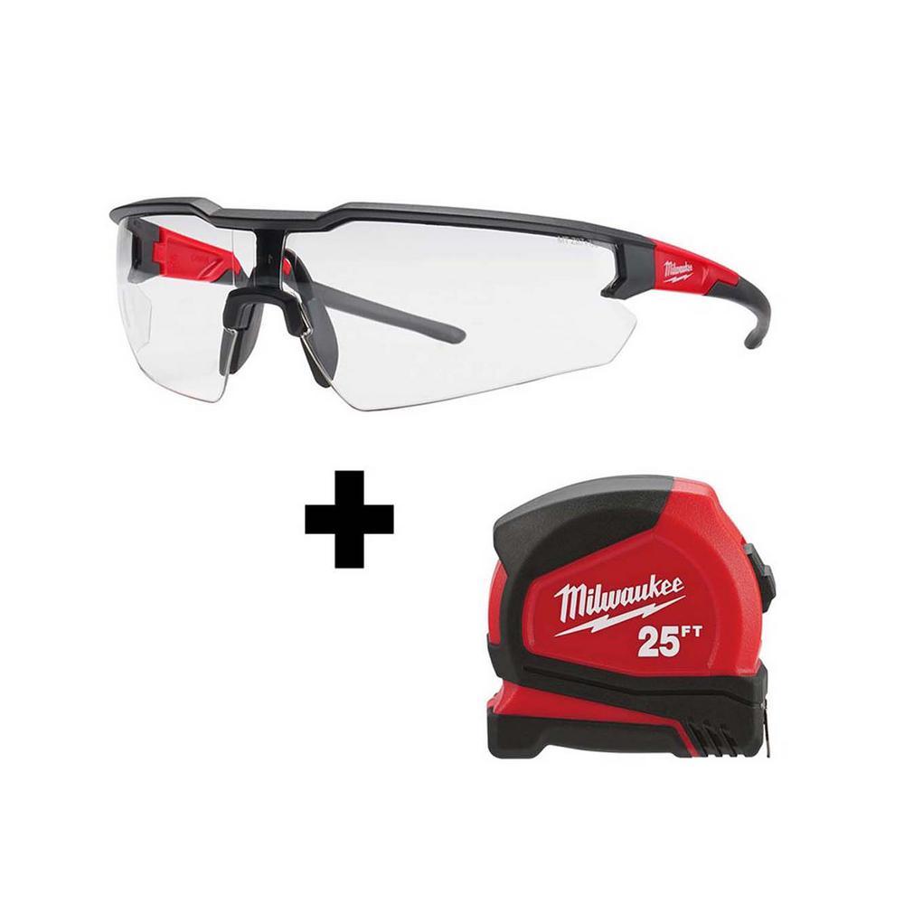 The Milwaukee Safety Glasses are designed with Anti-Fog, Anti-Scratch lenses. The protective eyewear features anti-fog lenses to reduce fogging. Durable anti-scratch lenses protect user's eyes while withstanding the demands of a job site. Additionally, these protective glasses have an integrated flexible nose bridge providing users with extended comfort. Clear and tinted options are available so the user's eyes stay safe whether working indoors or outdoors. The Milwaukee 25 ft. Compact Tape Measures deliver up to 12 ft. of reach. These tapes are equipped with wear resistant nylon blade protection and an Impact-resistant 5-point reinforced frame to withstand the jobsite. An integrated Stamped steel belt clip enables users to easily carry the tape measure with them around the jobsite. The tape blade also features a Fractional scale.
