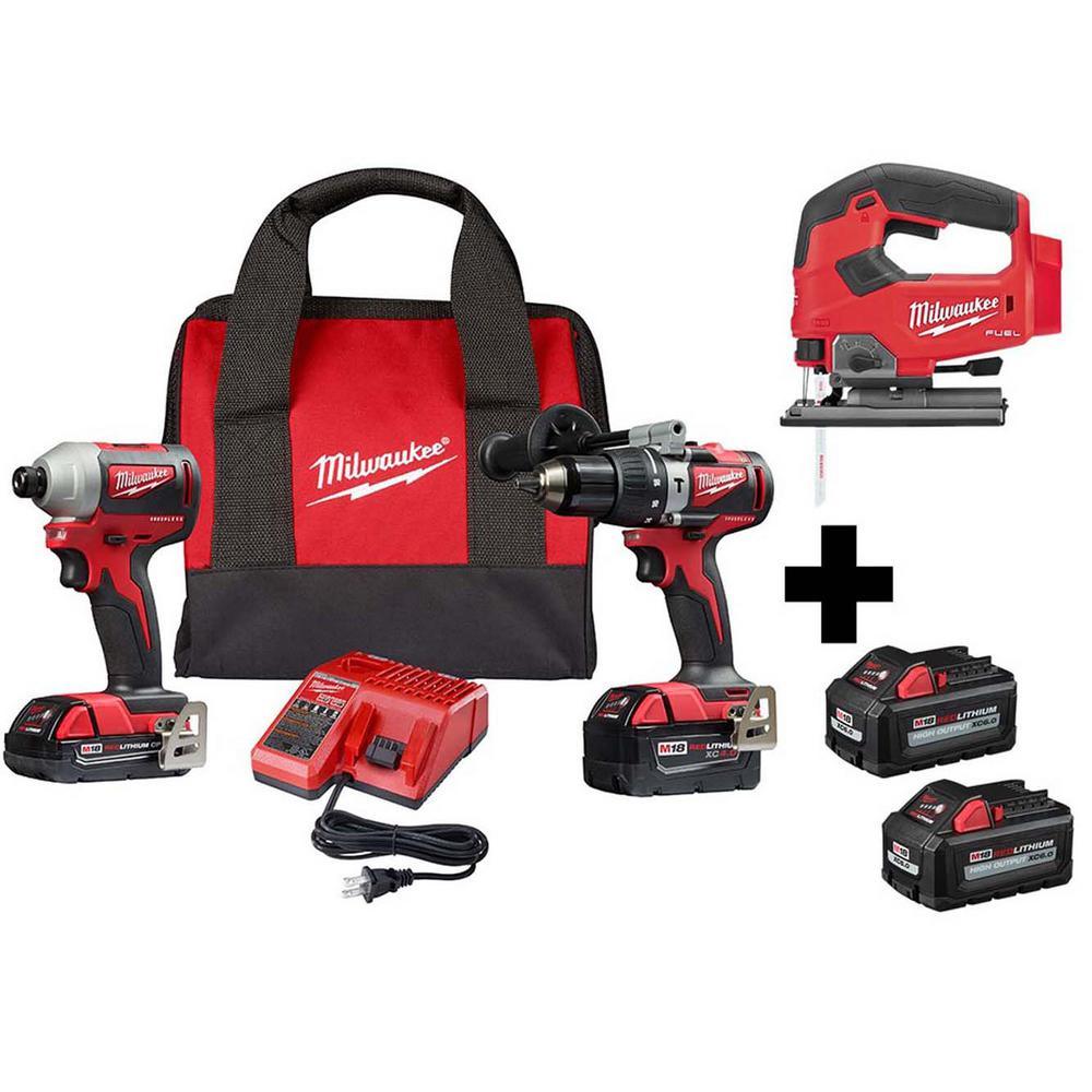 The M18 Cordless System's patented technologies and electronics, innovative motor design and superior ergonomics provide the most efficient blend of power, weight and performance in the industry. The M18 Brushless Hammer Drill/Driver is the Most powerful drill in its class at 725 in./lbs. of torque. The M18 1/4 in. Hex Compact Brushless Impact Driver has the fastest application speed its class and delivers 1,600 in./lbs. of torque. Both tools feature Milwaukee built brushless motors, REDLINK Electronics and REDLITHIUM batteries that provide more efficient power delivery, for fewer trips to the charger. The M18 FUEL Brushless Cordless D-Handle Jig Saw combines power, blade speed and precision, to provide the highest quality cuts in a wide variety of materials. The M18 FUEL D-Handle Jig saw leverages the POWERSTATE Brushless Motor and REDLINK PLUS Intelligence to provide higher blade speed than corded jig saws at 3500 strokes per minute for clean controlled cuts with minimized chipping or bucking. The M18 REDLITHIUM HIGH OUTPUT XC6.0 Battery Pack provides 50% more power and runs 50% cooler versus M18 REDLITHIUM XC battery packs. The optimized combination of size and increased power provides a great solution for the entire range of M18 products.