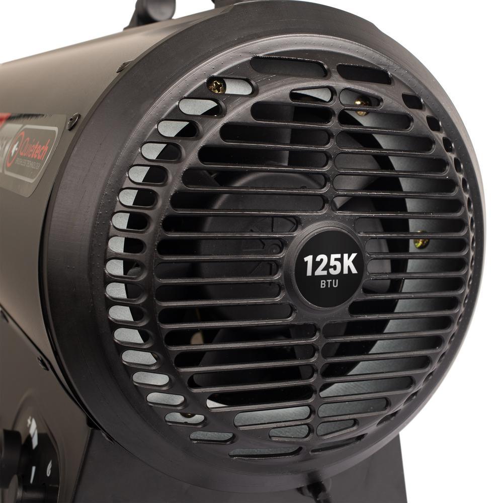 The Dyna-Glo Silent Flame LPFA125Q Portable Forced Air Heater generates instant heat for construction sites, industrial work spaces, agricultural buildings, outdoor sporting events and other ventilated spaces. Rated at 70,000 to 125,000 BTUs with a 300 CFM blower, the LPFA125Q heats a maximum of 3,100 sq. ft. for a period of 7-hours to 30-hours depending on the BTU level selected and the size of the propane tank. The LPFA125Q requires electricity to power the motor and fan and it is fueled by a 40 lbs. or 100 lbs. liquid propane (LP) tank (not included).