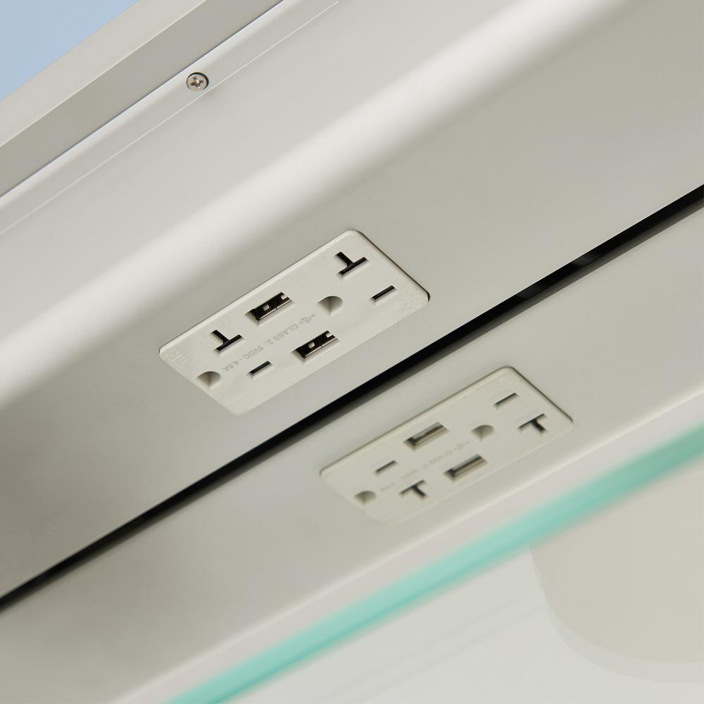 Features Adjustable Hinges,Adjustable Shelves,Beveled Edge Mirror,Glass Panel Door(s),Lighted,With Electrical Outlet