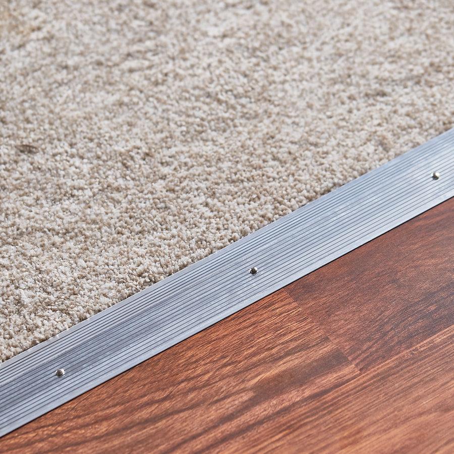 Transitions medium-high pile carpet to other surfaces of lesser height Covers seam and protects edges of flooring Fluted product design with a mill finish Includes pre-drilled holes Fasteners provided