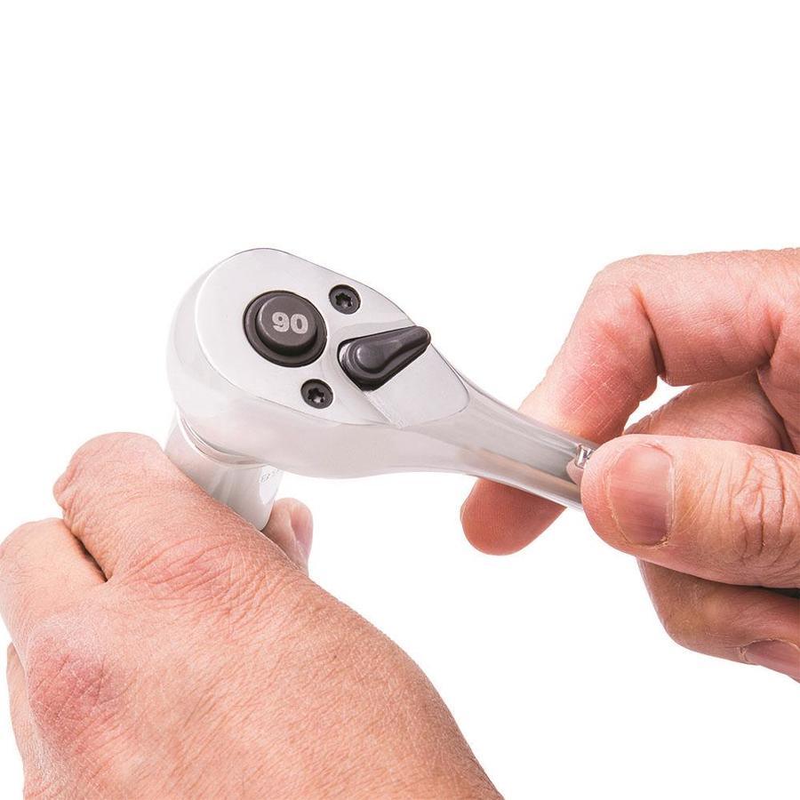Quick-release button allows rapid socket and/or accessory change Fine 90-tooth design provides 4 ° of arc swing Constructed of chrome vanadium steel and heat treated for strength and durability Professional grade, high-polish finish Meets or exceeds ASME specifications Hassle-free lifetime guarantee