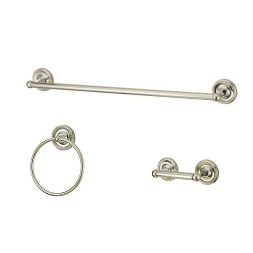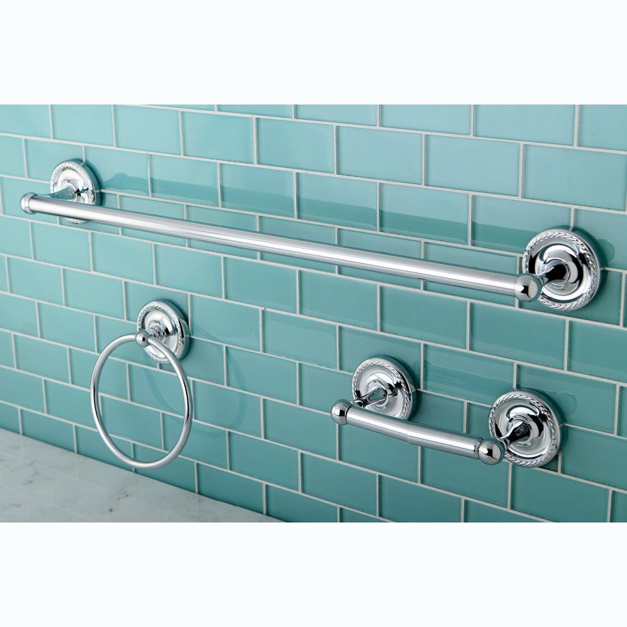 The Laurel Collection features rope-lined escutcheons and intricate textures for a graceful and cherubic bathroom Constructed of solid forged brass for durability and a rich finish Set includes: 24 in. towel bar, towel ring and toilet paper holder Concealed screws secure wall-mounted fixtures