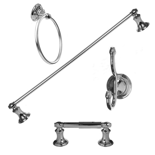 Set includes: 24 inch towel bar, toilet paper holder, towel ring and robe hook Lifetime limited warranty Design and quality defined Easy quick-mount design installation system