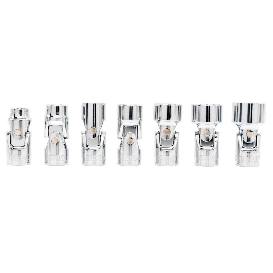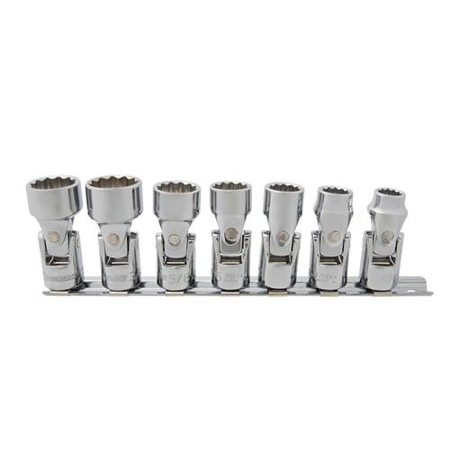 3/8-Inch drive flex socket set contains SAE sizes: 3/8, 7/16, 1/2, 9/16, 5/8, 11/16 and 3/4-inch Perfect for access into tight work spaces and off-angle fastener installation or removal 12-Point socket design allows work on multiple fastener types including 6-point, 12-point, square, star and some rounded 12-Point design also provides flexibility and versatility in socket positioning Constructed of chrome vanadium steel and heat treated for strength and durability Professional grade, high polish finish Size callouts are hard stamped Meets or exceeds ASME specifications Hassle-free lifetime guarantee