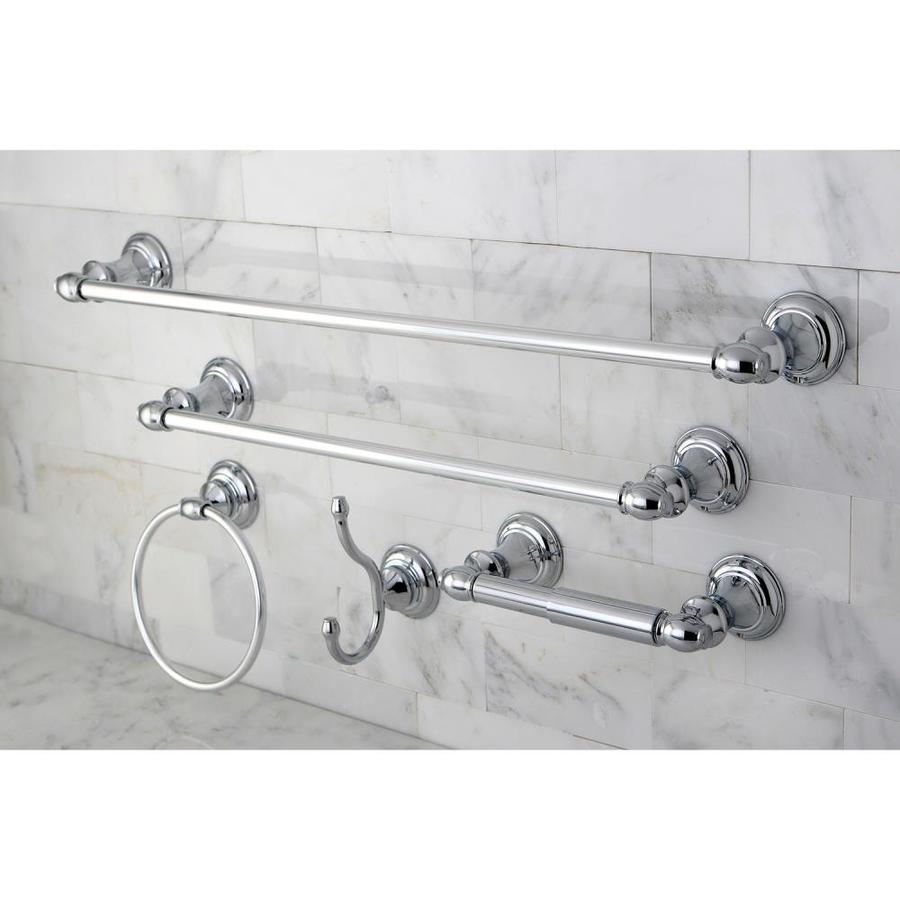 The Classic collection gives today’s functionality with yesterday’s elegance Constructed of metal for durability and a rich finish Set includes: 24 in. towel bar, 18 in. towel bar, towel ring, robe hook and toilet paper holder Concealed screws secure wall-mounted fixtures