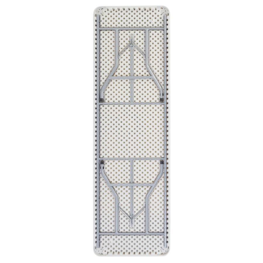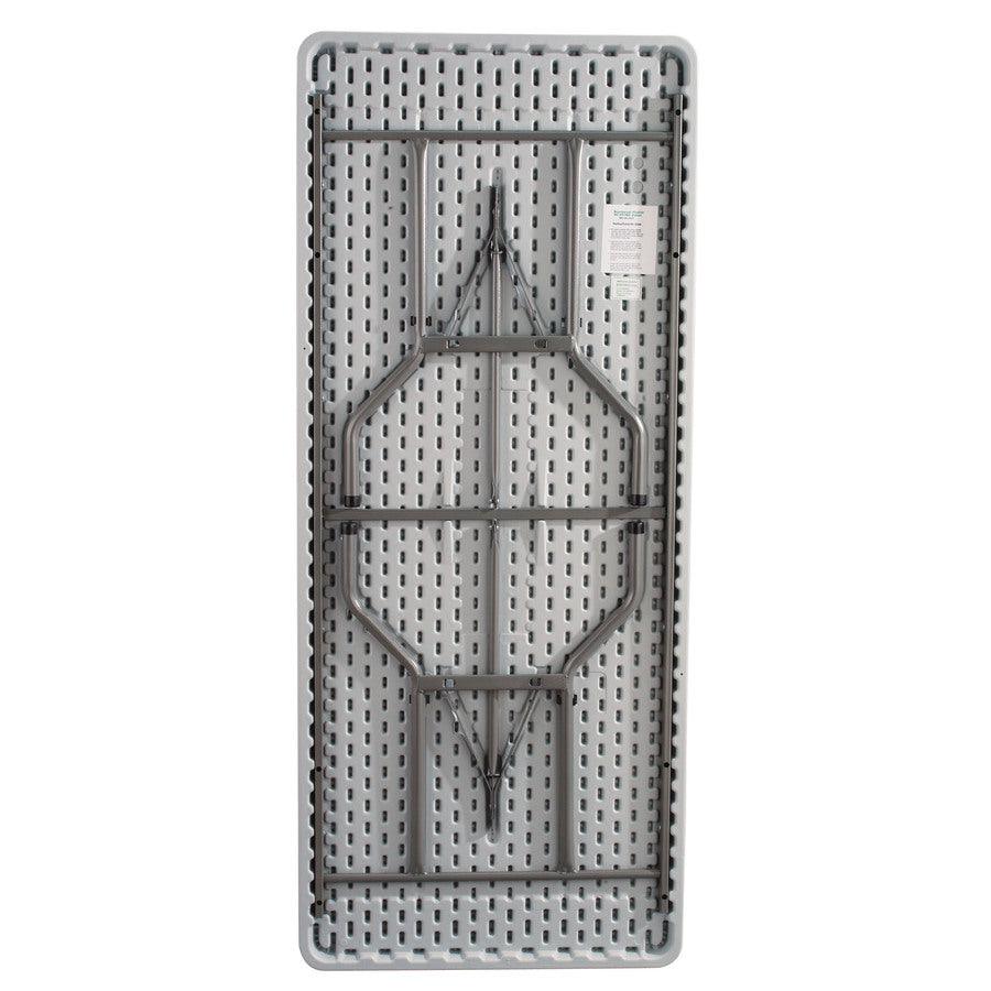 Professional grade blow molded folding table 30 x 96-in engineered for commercial catering use 17 Gauge steel frame Lightly spotted grey top with grey textured powder coated wishbone style legs 800 lb weight capacity Withstands heat up to 212 degrees Fahrenheit 2-In thick top for added strength Lightly textured surface to resist scratching yet smooth enough to write on Store up to 12 tables on transport cart item number 599822 10 Year limited warranty