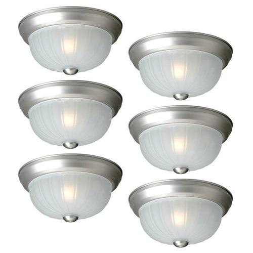 Six 10-in W ceiling flush mounts Brushed nickel finish for a smooth look Frosted glass shade is sophisticated Six 60-watt A19 bulbs required (not included) Great for traditional style decor ETL listing demonstrates this product has met minimum requirements of widely accepted product safety standards