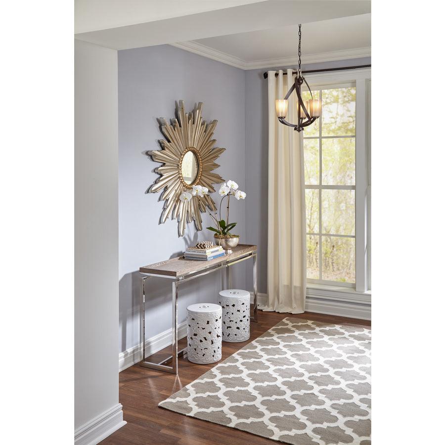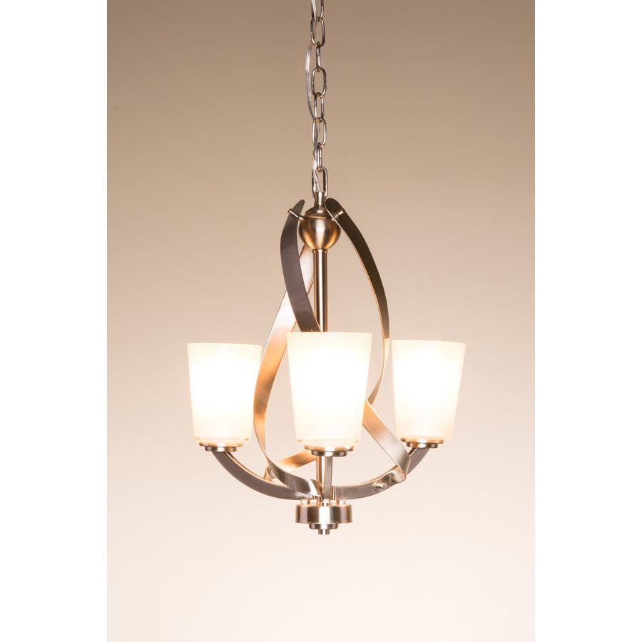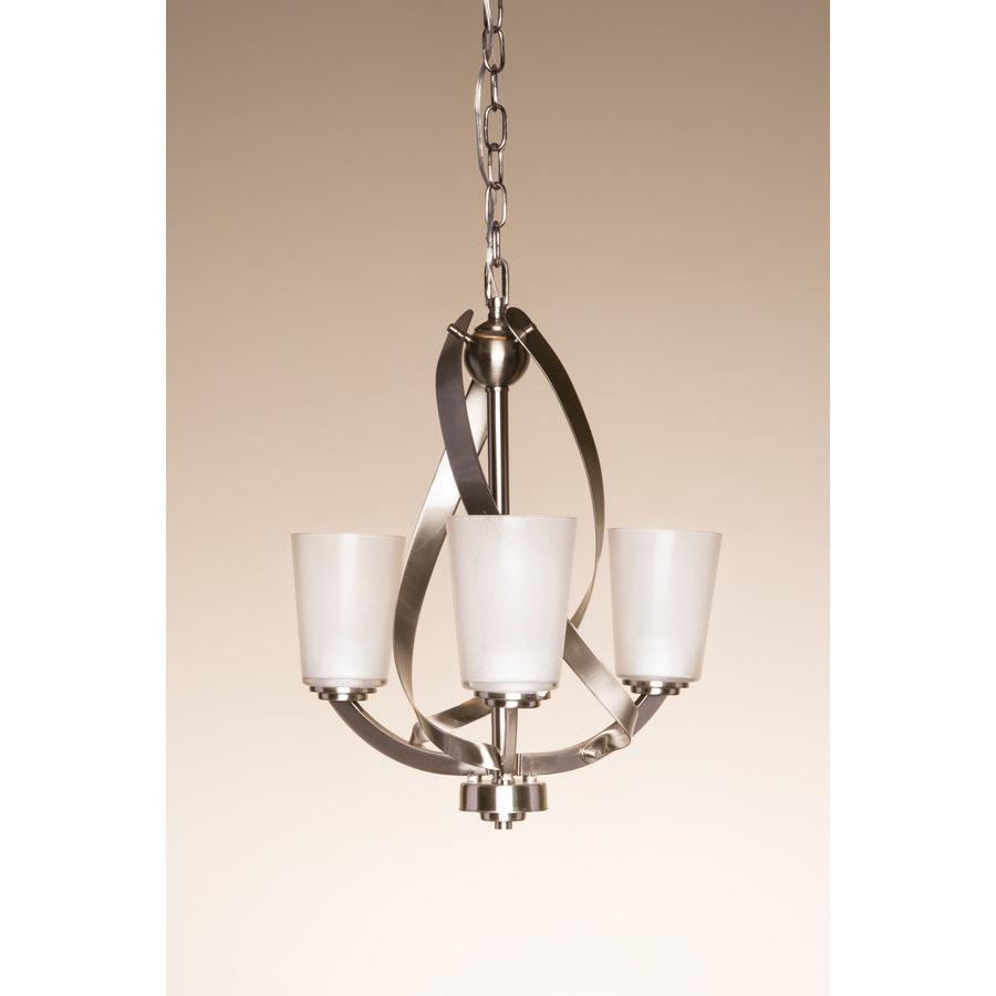 Brushed nickel finish chandelier from the Layla collection is a modern classic The piastra glass shades create an air of refined elegance Requires three 60-watt medium base bulbs (sold separately) Fixture dimensions: 17.25-in W x 17.25-in D x 20-in H Installed as an up-light only (mounting hardware included) Chain adjusts up to 36-in Great for modern style decor ETL listing demonstrates this product has met minimum requirements of widely accepted product safety standards Light is dimmable, so you can create your desired ambiance