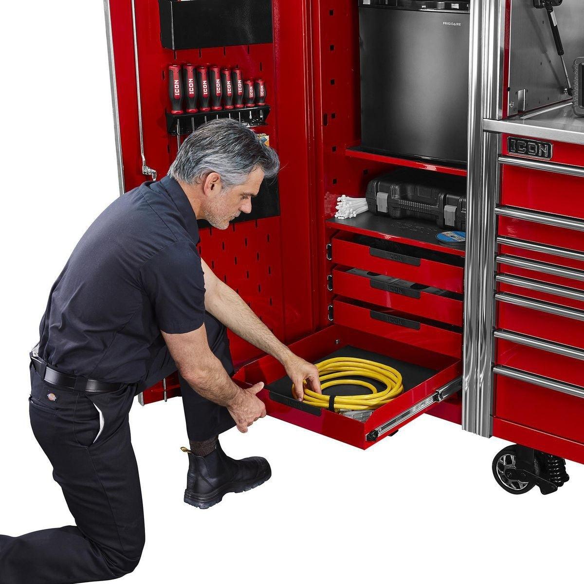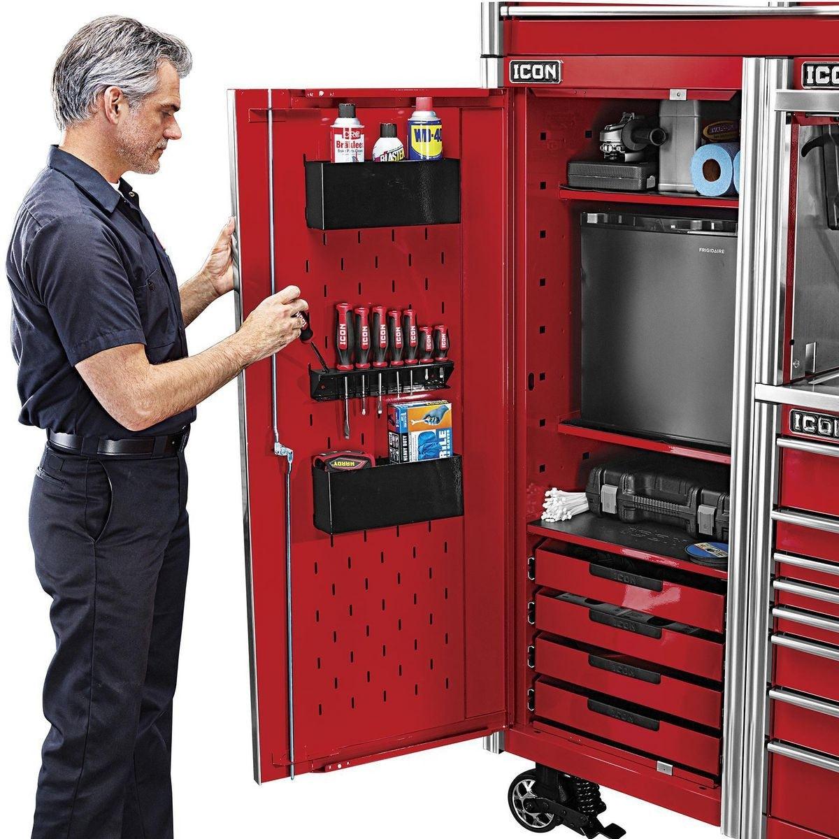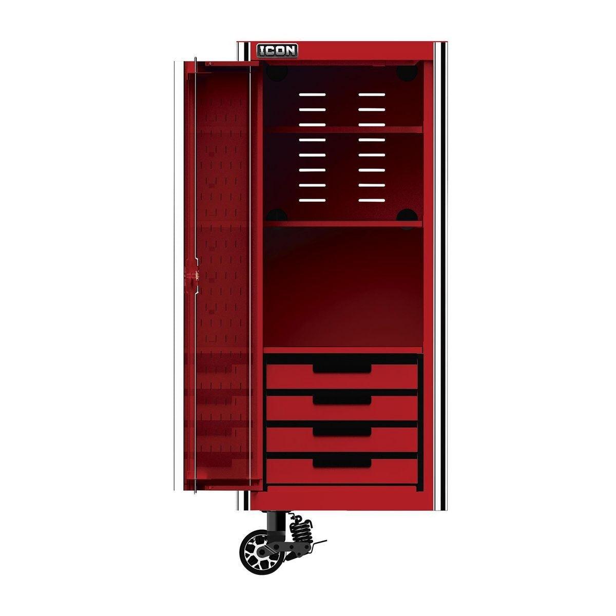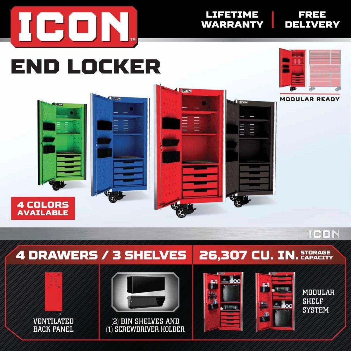 The Icon™ Professional 28 in. End Locker provides additional bulk storage, a modular shelf system and 4 adjustable drawers. The lockers feature rear access ports for running interior power and rear ventilation. With universal door hinges that open either left or right, they can be mounted to either side of a 56-inch or 73-inch cabinet. Lockers come with a screwdriver rack and two aerosol can holders. All Icon™ storage comes with free door-to-door delivery and a lifetime warranty - plus, a full line of replacement parts is available. It’s the only storage solution you’ll ever need.