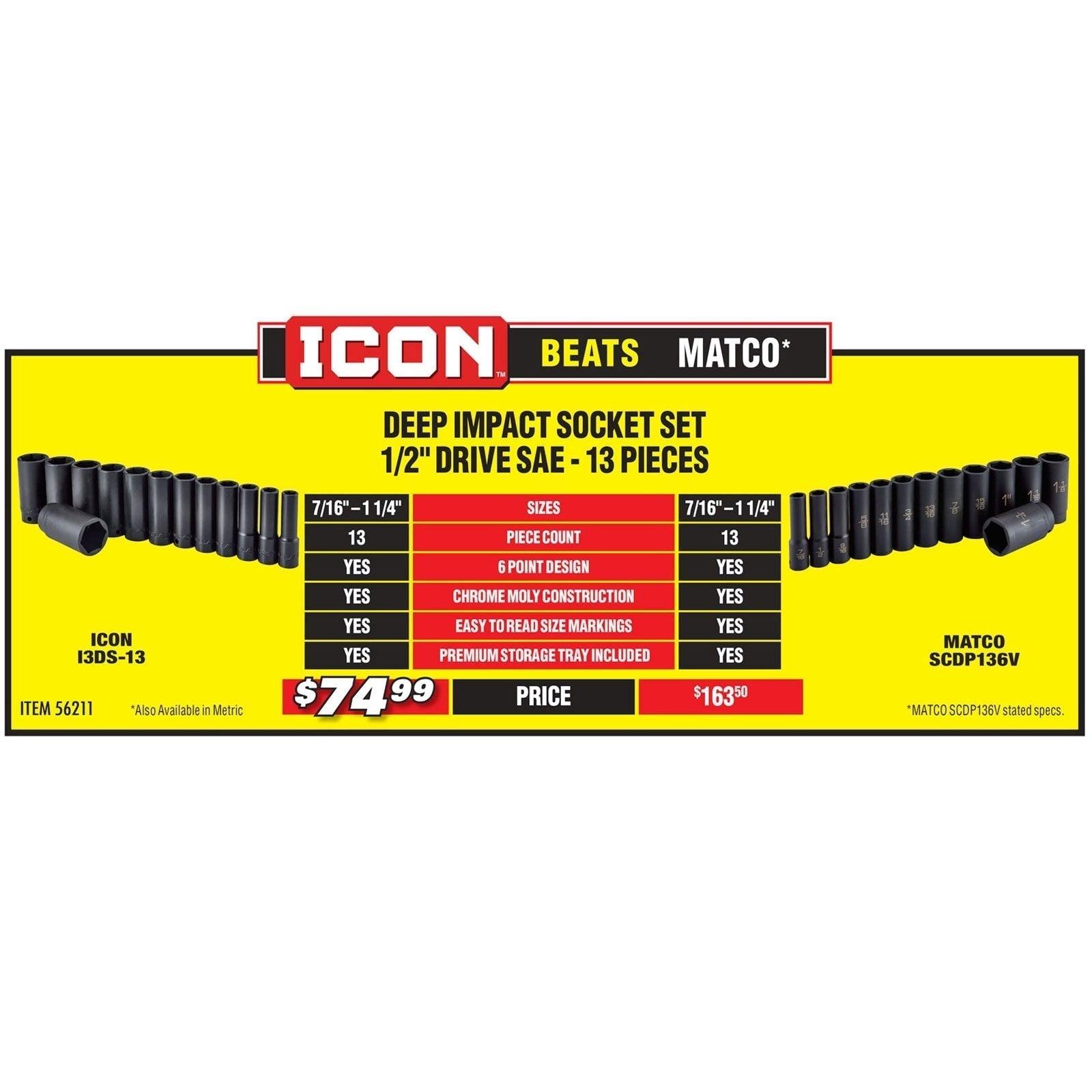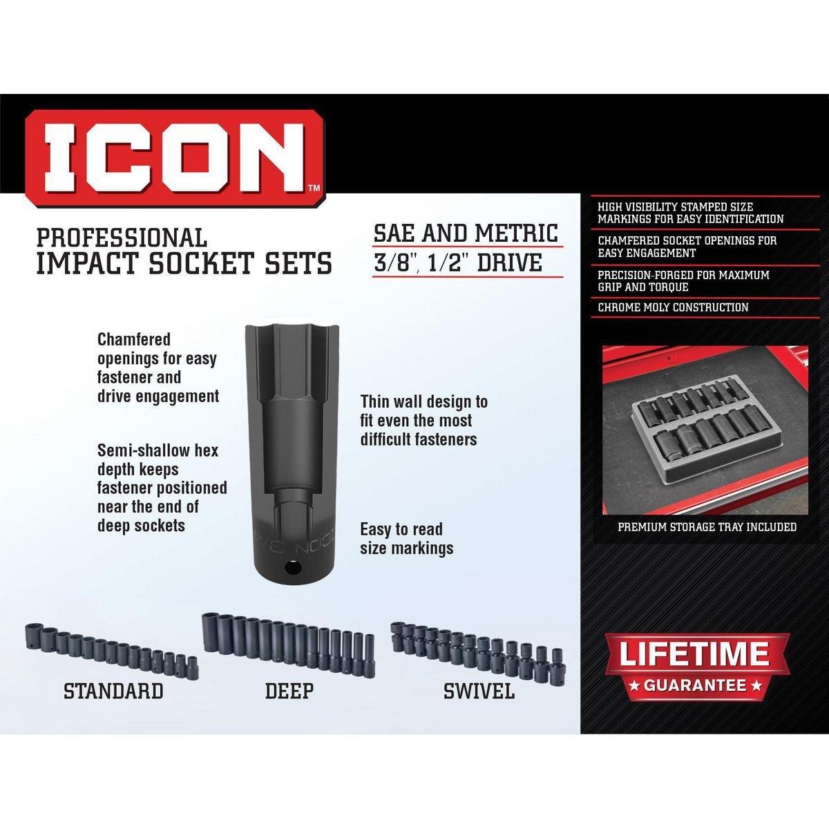 Icon™ Professional Impact Sockets are designed to stand up to professional shop use. We use a premium heat treated chrome moly steel, with a durable black phosphate finish that offers superior strength and corrosion resistance. All Icon™ sockets have a 6 point design for maximum torque, chamfered socket openings for quick fastener engagement, and a thin wall design for easy access on difficult fasteners. All impact sockets feature a semi-shallow hex depth to keep the fastener near the end of the socket for more efficient work. We've also added easy to read size markings, and included a premium storage tray to help keep your tools organized. Like the rest of the Icon™ hand tools, these sockets are backed by a hassle-free, manufacturer’s lifetime warranty.