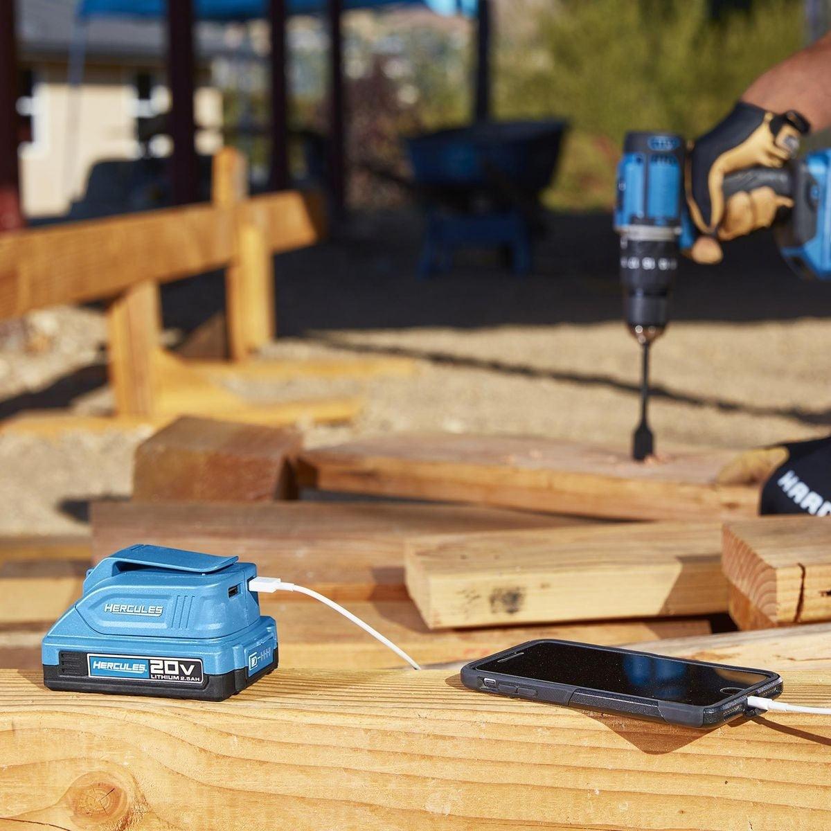 The 20V USB Power Source Adapter works with Hercules® 20V Lithium-Ion batteries to fully recharge two USB devices simultaneously. Includes molded belt clip and lanyard for easy storage on tool bags or tool belts and and durable design built to withstand jobsite abuse. Buy with confidence with an included no-questions-asked risk-free trial, with additional coverage up to 2 years.