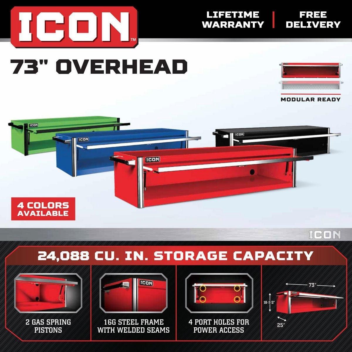 The Icon™ Professional Overhead unit can be added to the work center or top chest for additional open storage space and is ideal for specialty kits and tool cases. All Icon™ storage comes with free door-to-door delivery and a lifetime warranty—plus, a full line of replacement parts is available. It’s the only storage solution you’ll ever need.