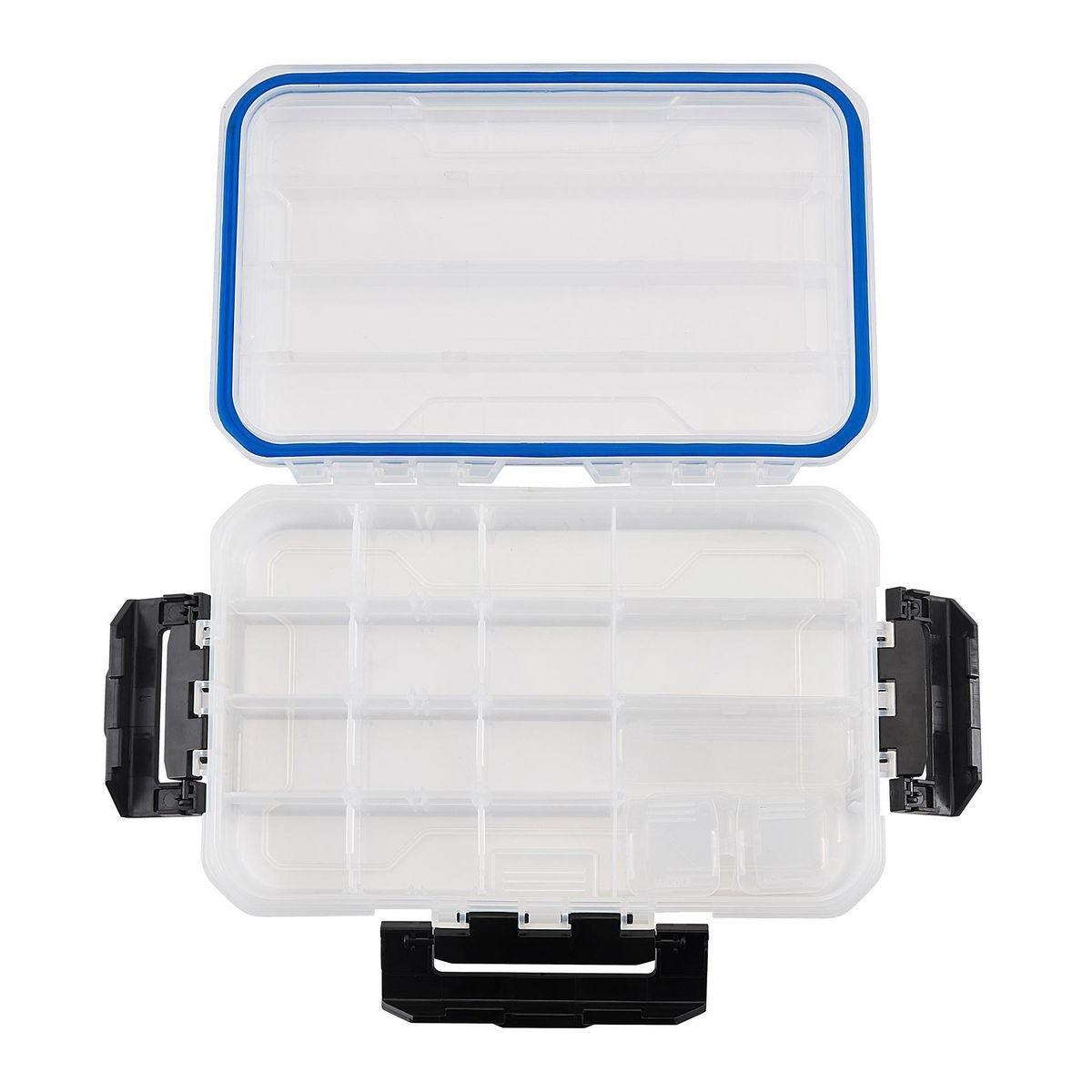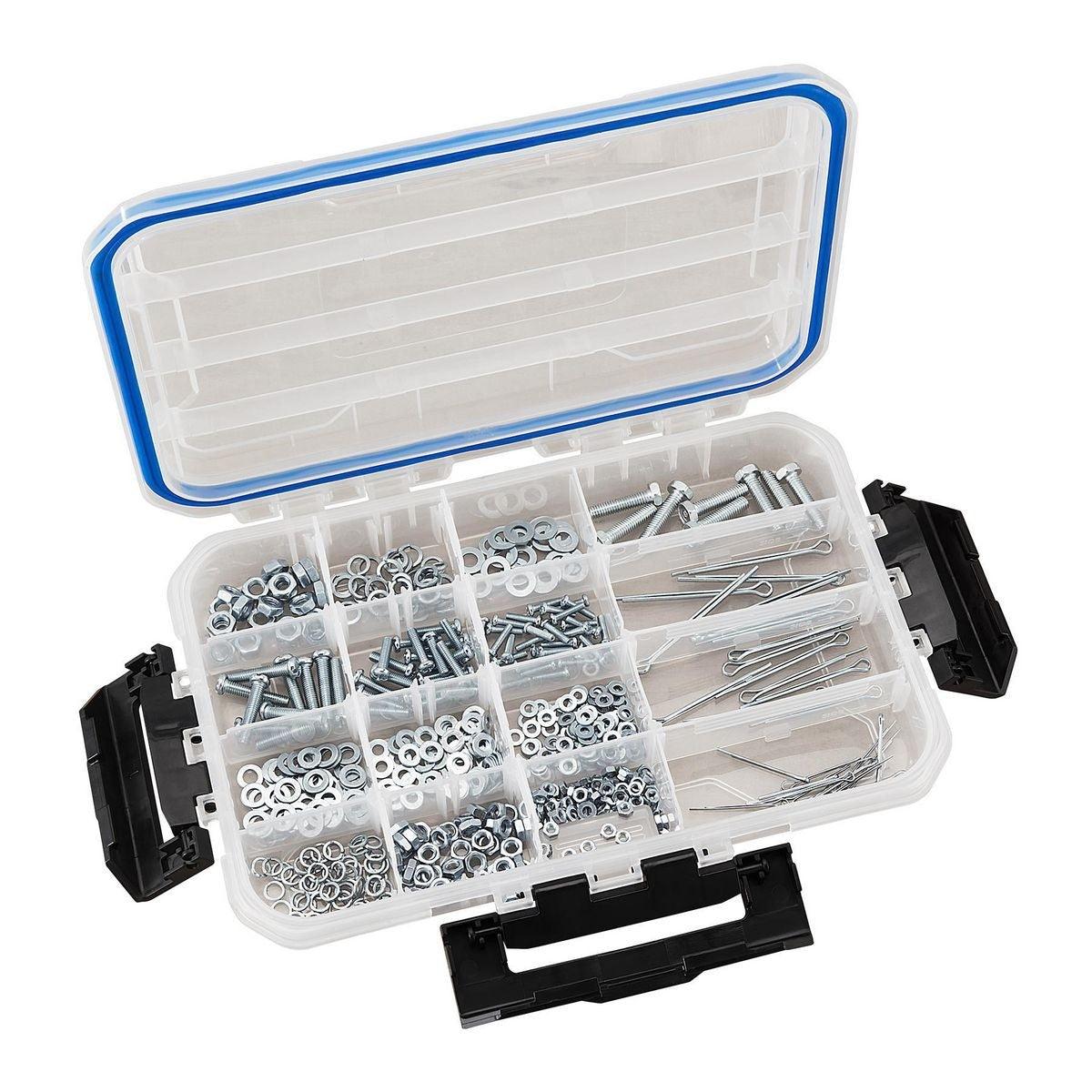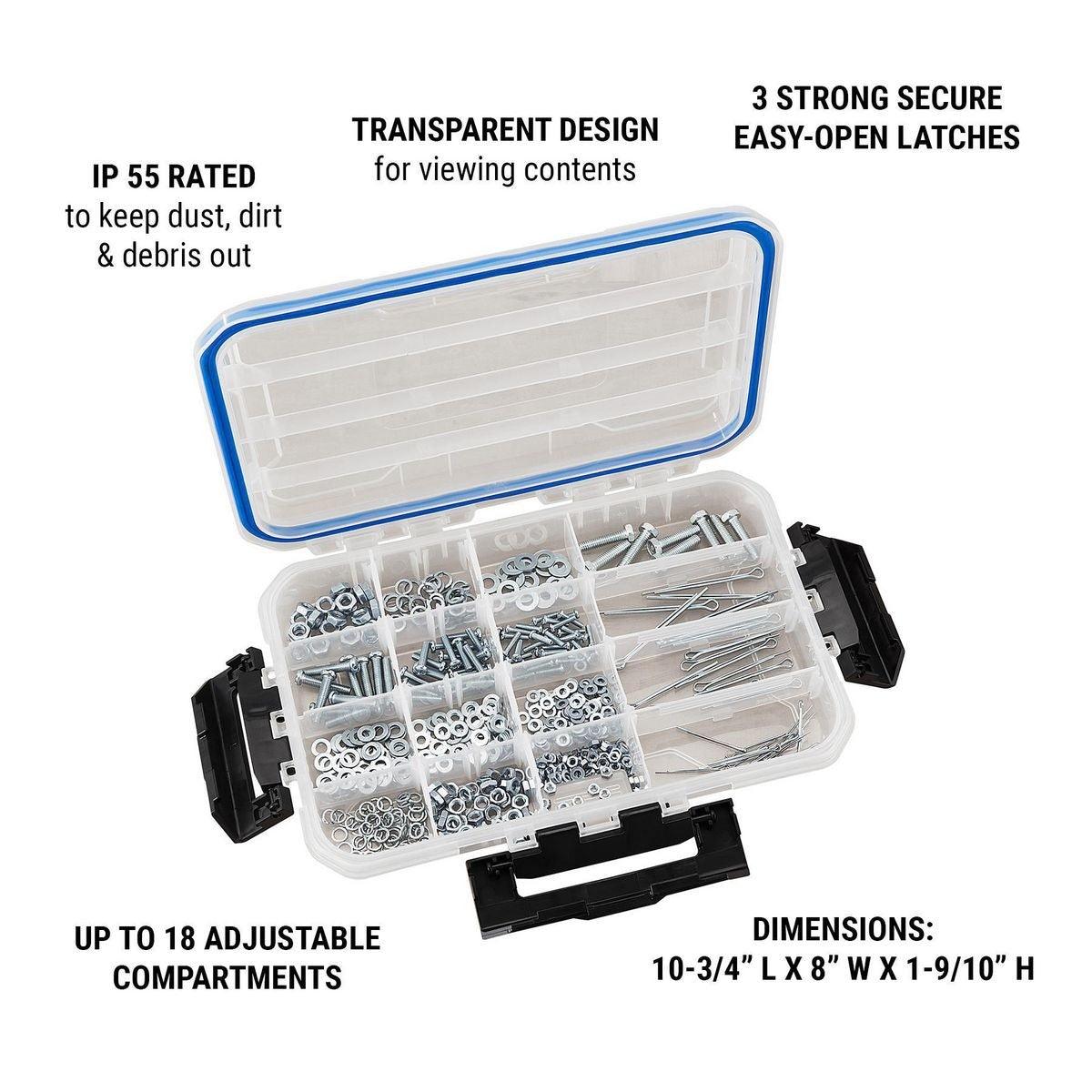 This clear medium organizer has up to 18 individual compartments for storing parts or supplies. Three strong easy-open latches keep the lid sealed tight to keep out dirt, dust and debris. This medium organizer is transparent so the contents can be easily viewed. Ideal for fasteners, fishing tackle, craft supplies, and more!