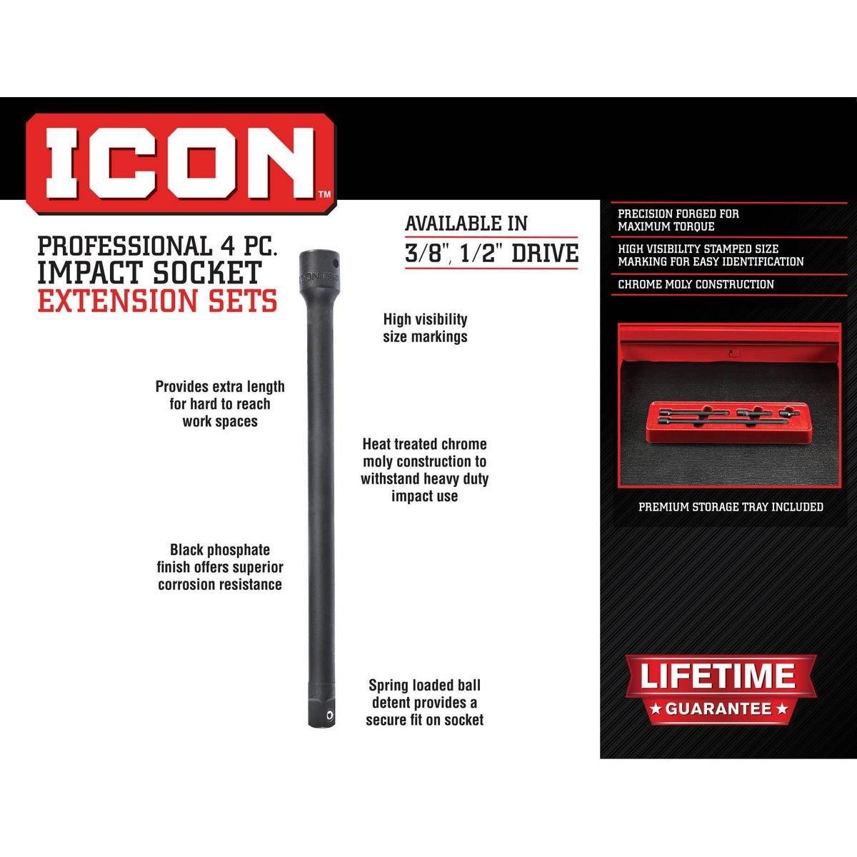 Icon™ Professional Impact Socket Extensions are designed to stand up to professional shop use. We use a premium heat treated chrome moly steel, with a durable black phosphate finish that offers superior strength and corrosion resistance. All Icon™ socket extensions have a durable spring-loaded ball detent to provide a secure fit on the socket. We've also added easy-to-read size markings, and included a premium storage tray to help keep your tools organized. Like the rest of the Icon™ hand tools, these socket extensions are backed by a hassle-free, manufacturer’s lifetime warranty.