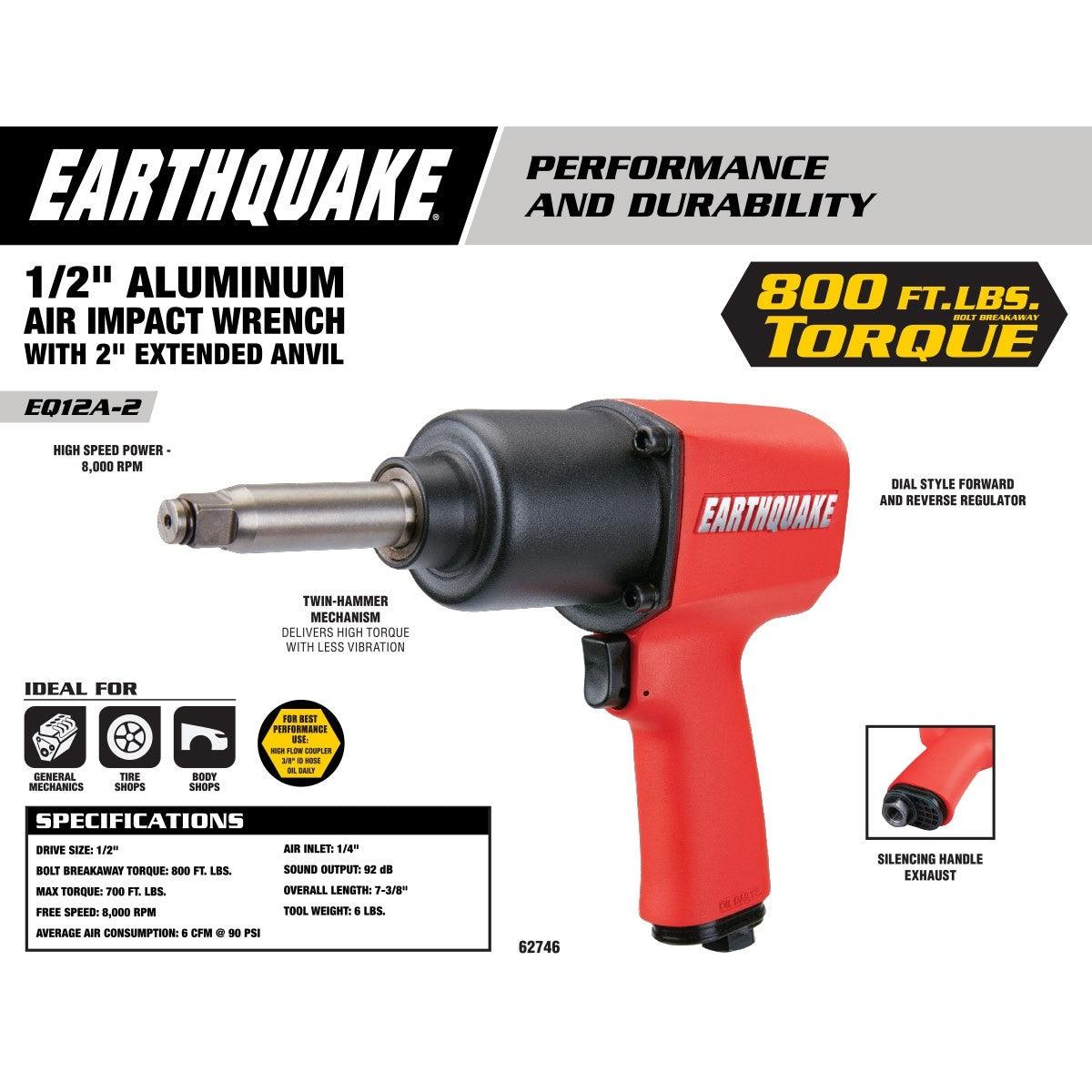 This rugged air impact wrench has a tough aluminum housing designed for power and durability. This reliable pneumatic impact wrench delivers 800 ft. lbs. of bolt breakaway torque to get tough jobs done fast. A 2 in. extended anvil helps reach recessed fasteners in deep well wheels.