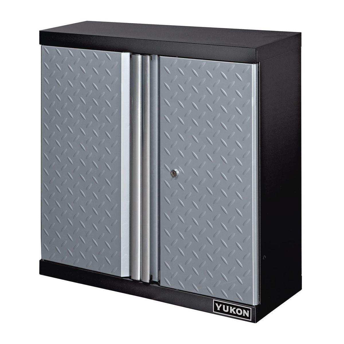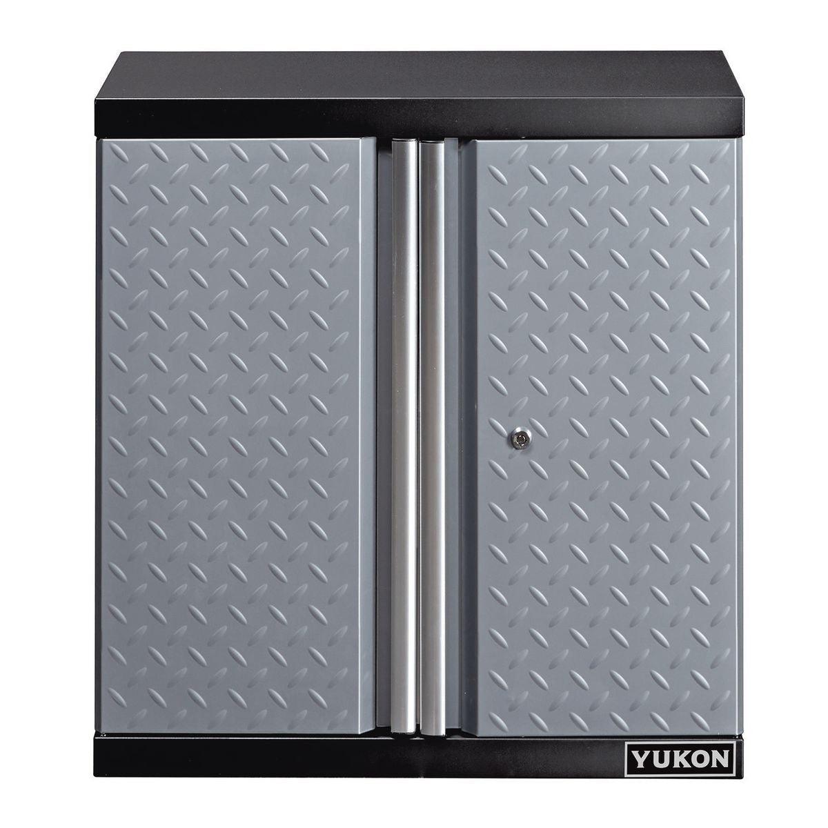 The Yukon® 27 in. Garage Wall Cabinet is part of a complete shop storage system designed to organize and free up space in any area. Constructed from powder coated steel for a durable, smooth finish and diamond plate steel doors for a professional look. With a rear power access port for cords and cables this garage cabinet offers generous storage space combined with convenience.