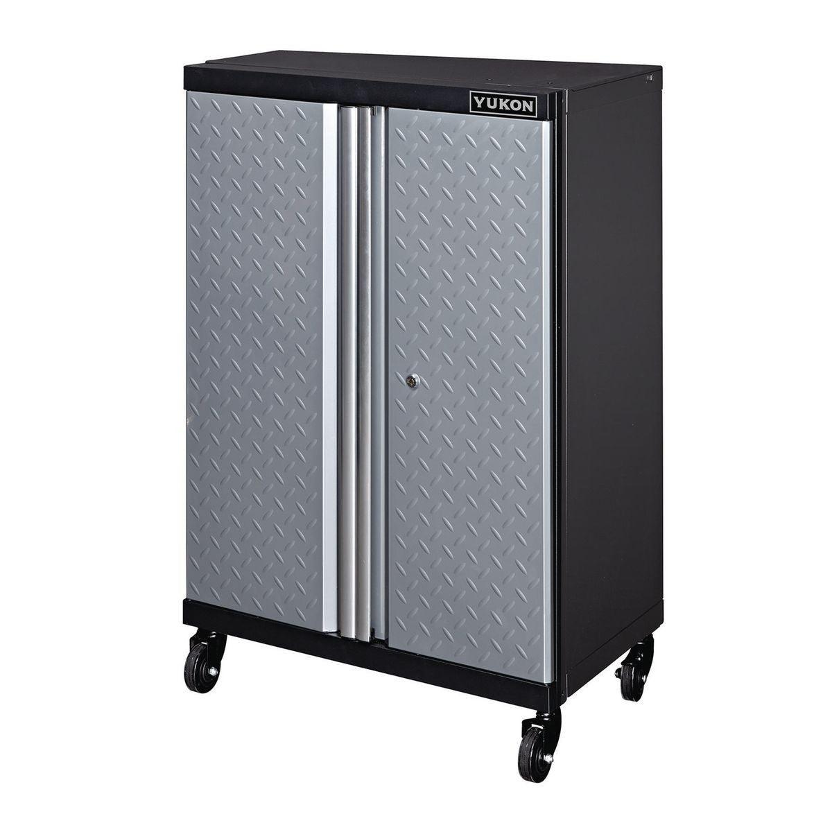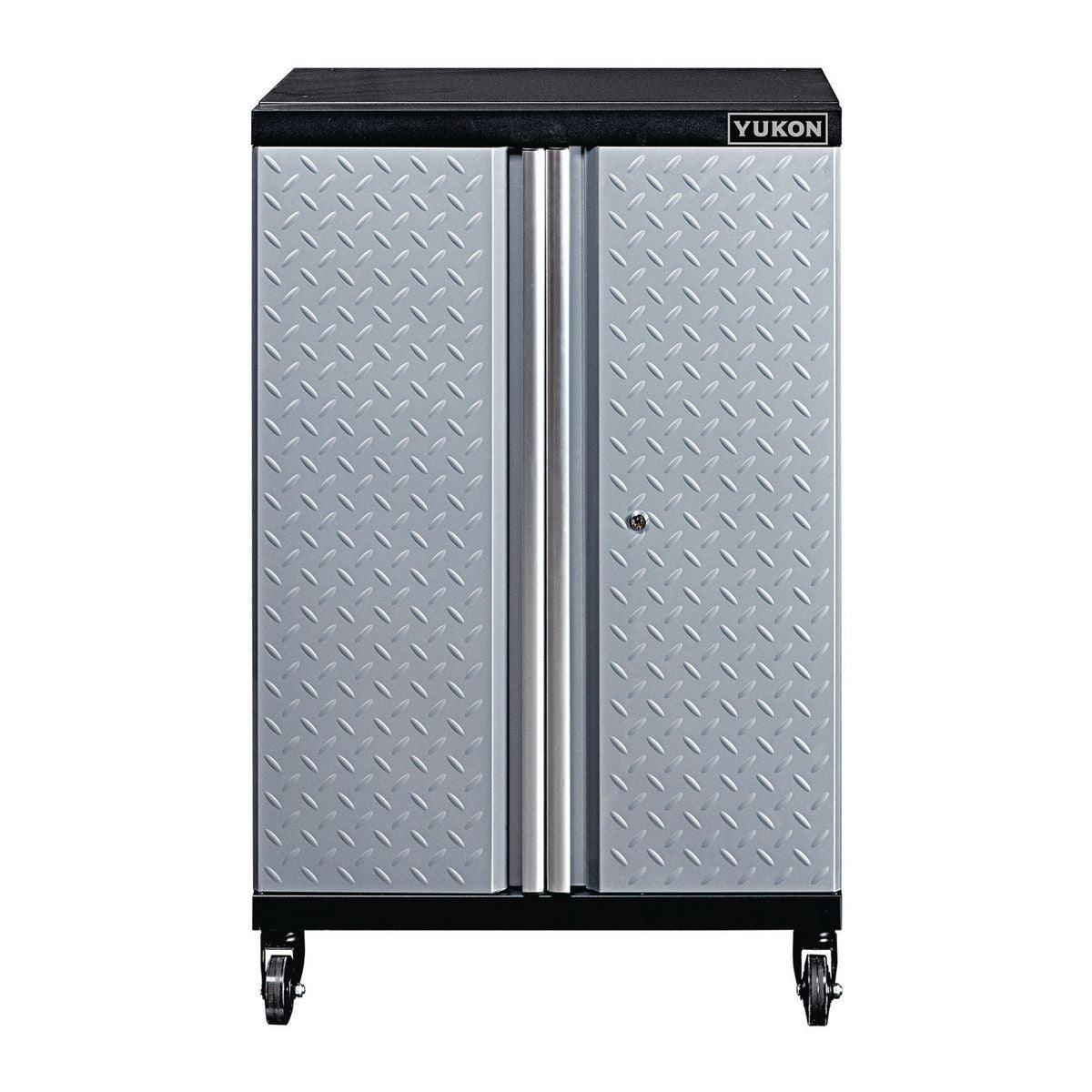 The Yukon® 27 in. Garage Cabinet with Casters is part of a complete shop storage system designed to organize and free up space in any area. Constructed from powder coated steel for a durable, smooth finish and diamond plate steel doors for a professional look. With four smooth rolling, 360° swivel casters (two with locking brakes) and a weight capacity of 250 lbs. this garage cabinet provides a generous storage space making it the ideal solution for all your storage demands.