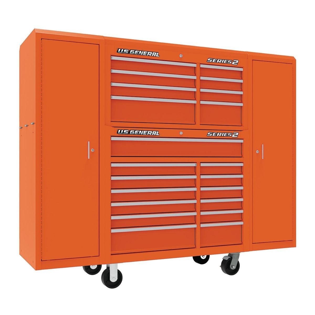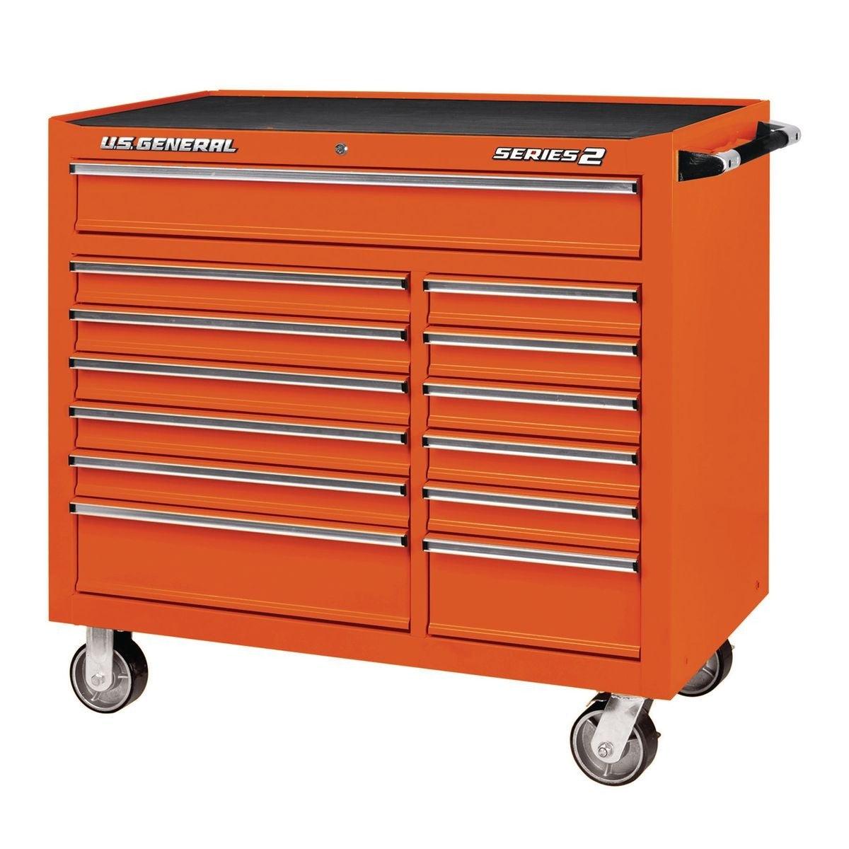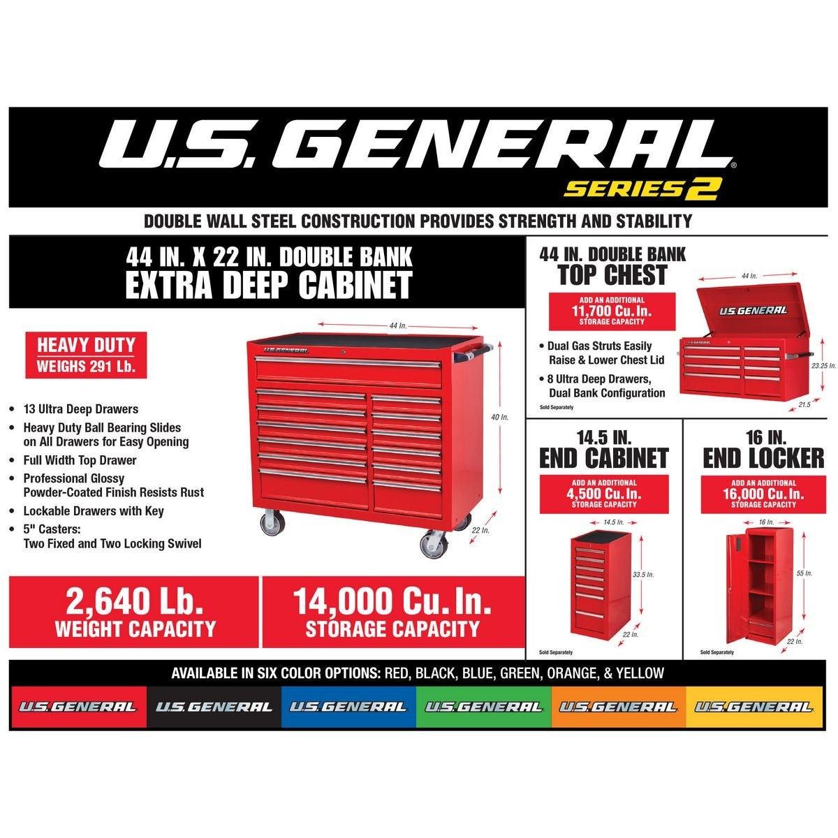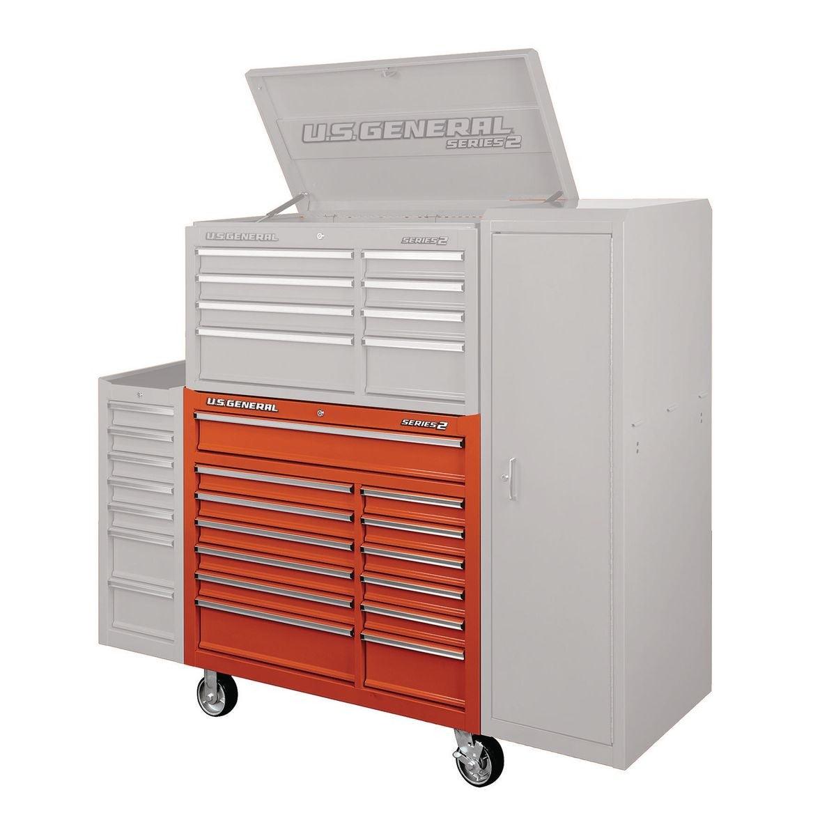 This 44 in. industrial grade roller cabinet was designed, tested, and built to last. This double bank unit has full extension drawer slides with double slides on the large drawers. With 14,000 cu. in. of storage available, the double bank drawer configuration with 13 drawers gives you the flexibility to organize a wide variety of tools with narrow, wide and extra-wide drawer options. The industrial powder coat finish is durable, easy to clean and looks great in any garage.