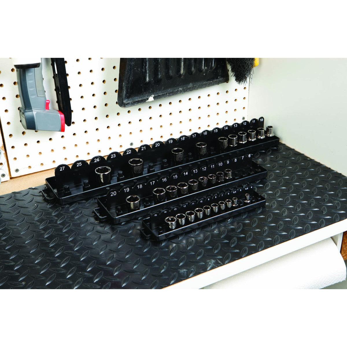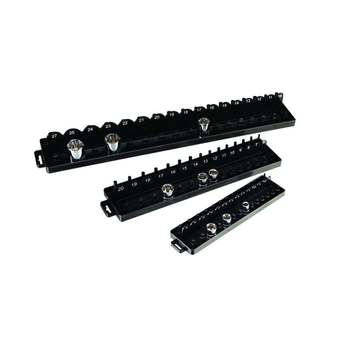 This socket organizer set fits neatly in your tool chest or can be mounted to your wall or pegboard to organize your sockets for quick and easy identification. The socket organizer fits most socket designs and holds both regular and deep sockets. Trays for 1/4 in., 3/8” and 1/2 in. drives are included.