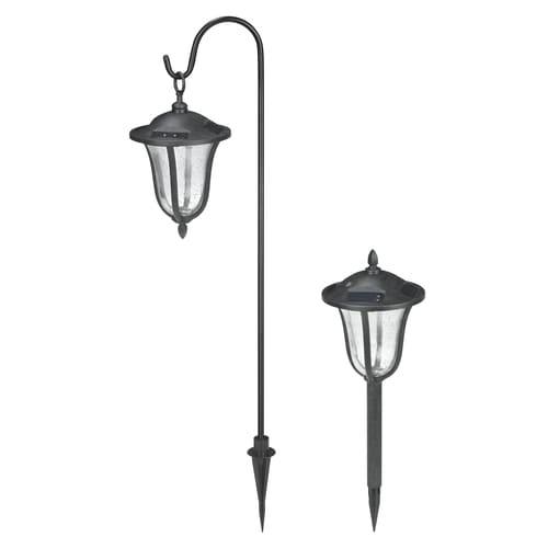 Includes (2) lights, (2) solar rechargeable batteries, (2) stakes and (2) shepherd's hooks Uses (1) 400mAh lithium-phosphate 14430 solar rechargeable battery each light Ideal for illuminating pathways, gardens and patio spaces 12 times brighter than standard solar lights, 15 lumens Environmentally friendly - powered by the sun Photocell control - automatically turns on at dusk and off at dawn 6 or 10 hours selectable working modes with different brightness Replacement batteries are available at ARB265W stores, sold separately