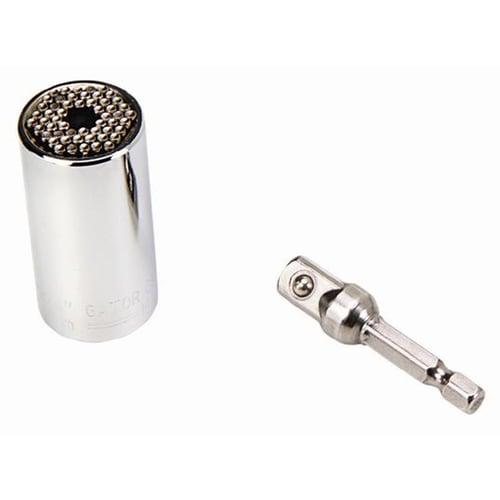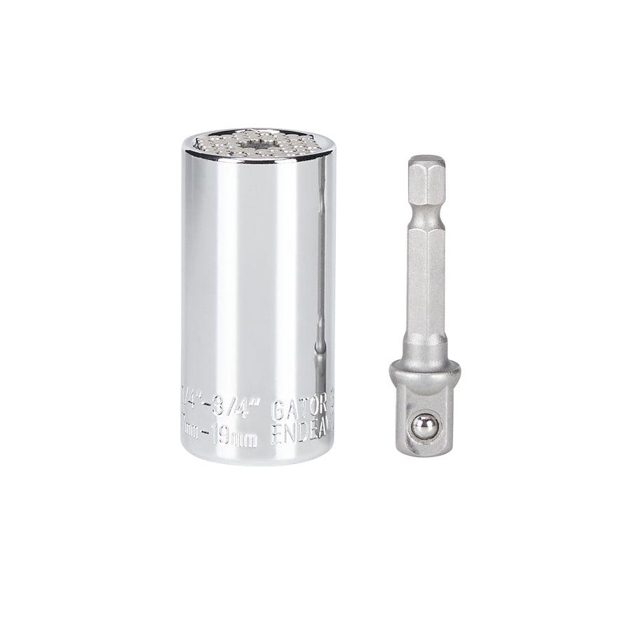 Gator Grip is a self adjusting universal socket with automatic standard and metric application Self adjusts from 1/4-in to 3/4-in standard and 7mm to 19 mm Gator Grip works in all shapes and sizes except a perfectly round head, just file an edge Works well on rusted and damaged heads Torque is over 100-lbs Works on a power drill (adapter is included) Made in the USA