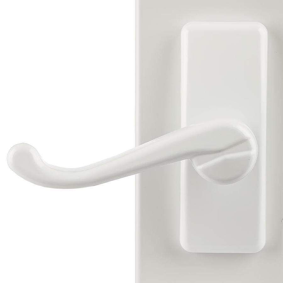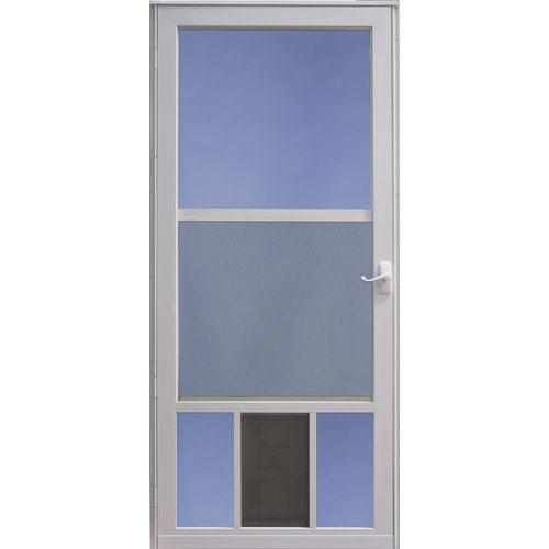 Factory-installed, flexible pet flap with 10-in x 17-in opening allows pets up to 100-lbs to pass through; magnetic bottom sweep helps protect against weather and drafts Inside pet door security panel keeps pet from using door or to close off opening when not in use Tear-resistant WearTuff Screen is 3-times stronger than regular screen material Durable all-metal construction withstands active pets Reversa Screen design allows for top or bottom ventilation Heavy duty weatherstripping seals out harsh weather and drafts Bottom expander adjusts to uneven sills to seal out harsh weather Color-matched handles include an inside lock EasyHang® installation requires no cutting and includes mounting rail extenders and pre-drilled hinge locator holes to provide an exact fit every time
