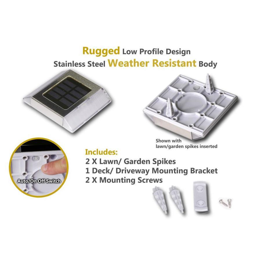 High Performance solar path light – stays lit for up to 10 hours Lights up automatically every night/auto – off switch 2 High output LED’s for brilliant white light 1 long life AAA Ni-MH rechargeable battery included Manufactured from durable Stainless Steel Quick and easy Do It Yourself installation 12 Lumens or 4500 – 5500 Kelvin