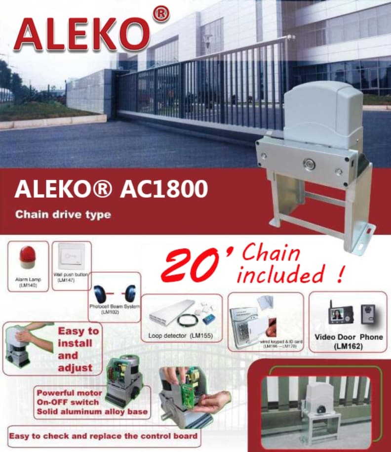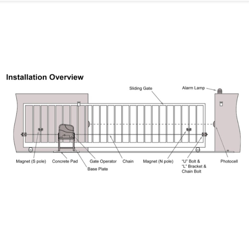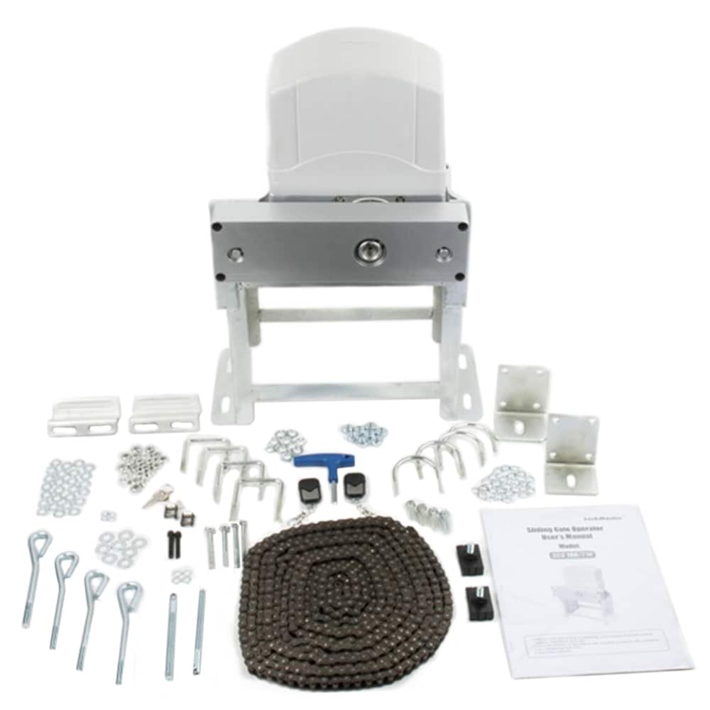 | Package Contents | 1 Sliding Gate Opener Unit, 1 (One) Set of 20 Ft Chain, 1 (One) Mounting metal base, 2 (Two) 433MHz remotes LM122, 1 (One) Set of accessories and mounting hardware for easy installation, 1 (One) User Manual with step-by-step installation instructions |