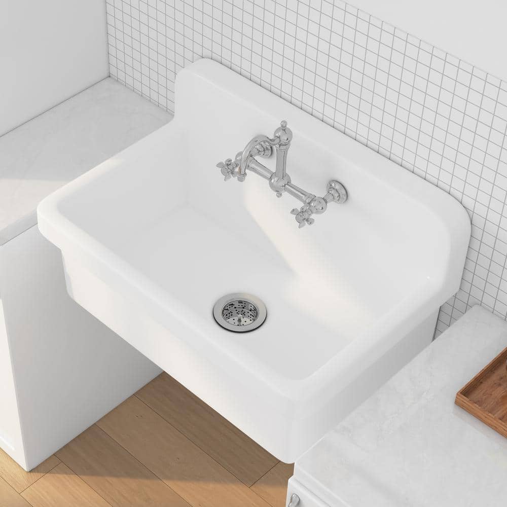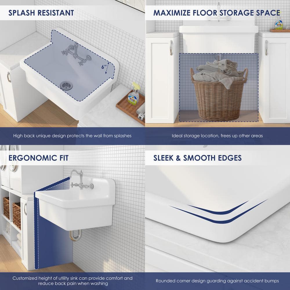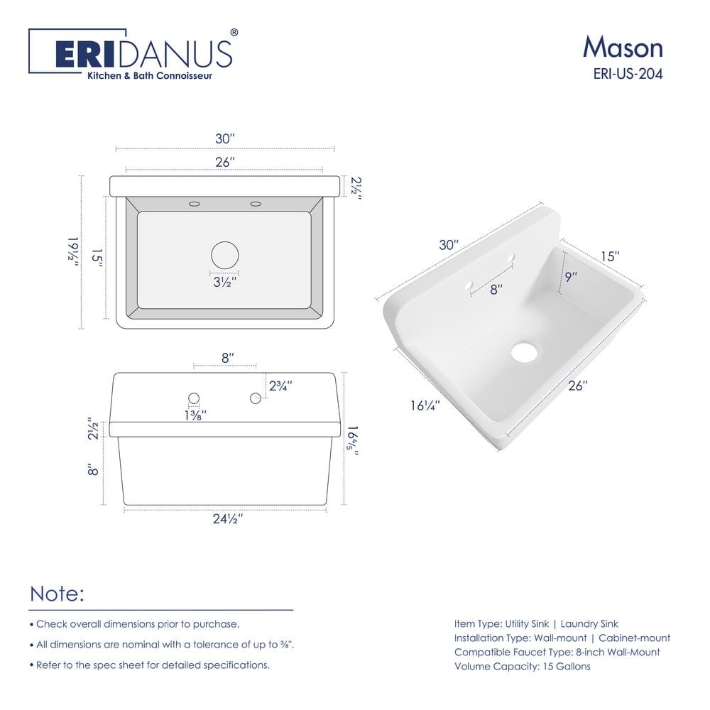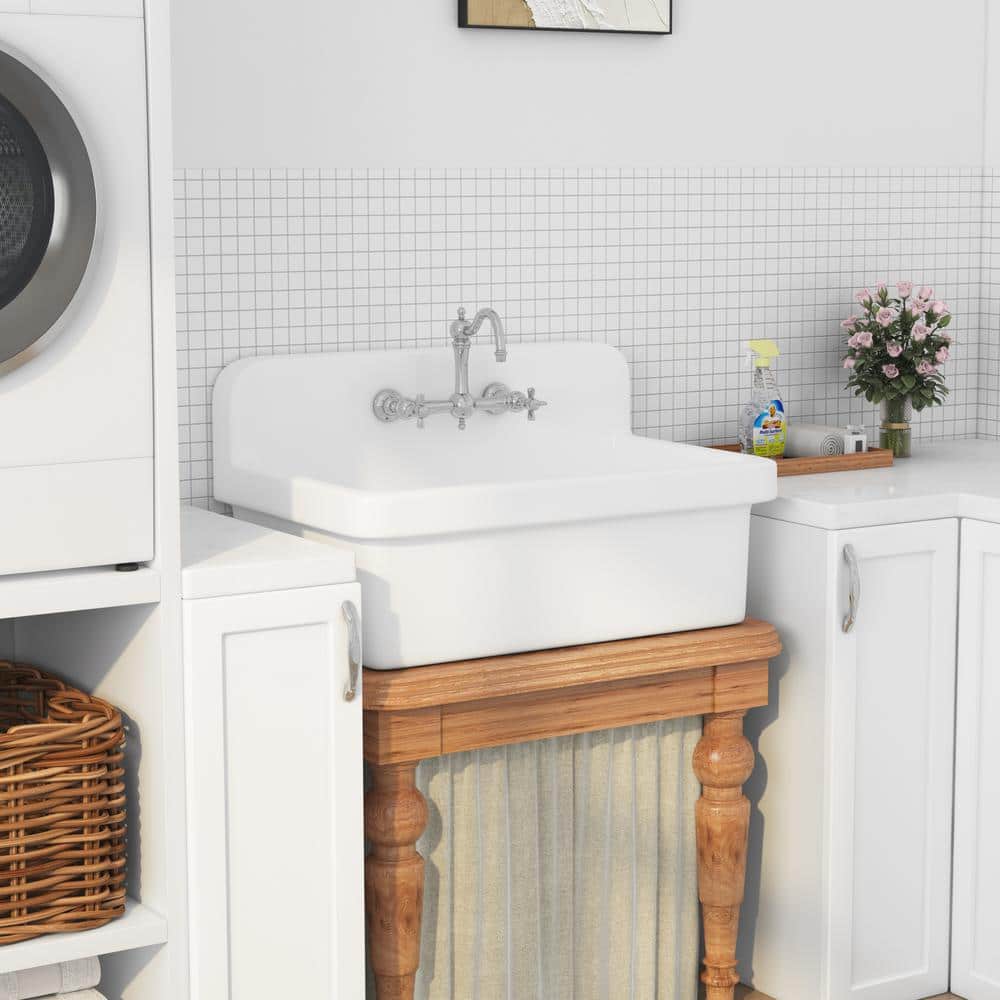 The Eridanus Mason 15 Gal. Utility Sink transforms any laundry or utility room with its classic farmhouse design and superior functionality. Made from durable vitreous china, this sink resists scratches and stains, providing a long-lasting workspace. Its wall-mounted installation saves space, making it ideal for busy, multipurpose areas.