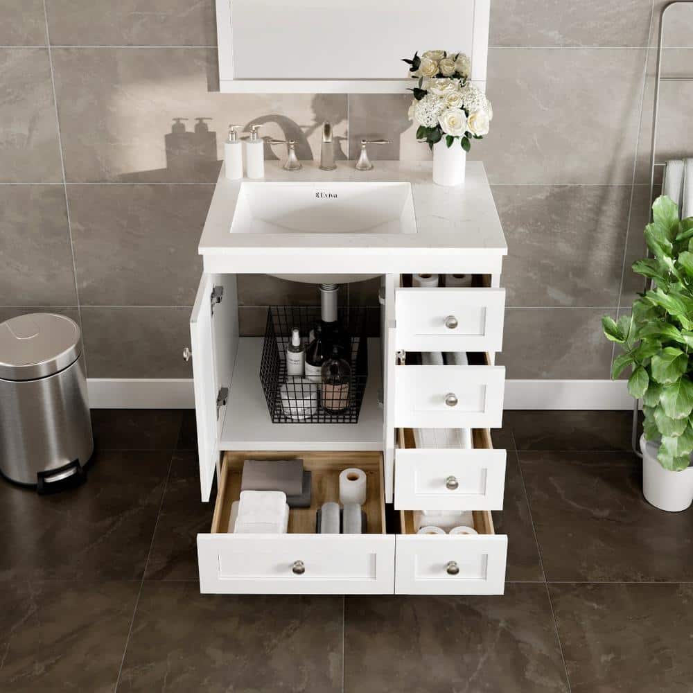 Elevate your bathroom's style with the Eviva Acclaim 28" Bath Vanity in classic white, featuring a luxurious white Carrara Quartz top paired with a sleek, undermount porcelain sink. With its premium solid wood construction and soft-closing doors and drawers, this vanity becomes the centerpiece of elegance and functionality in any bathroom renovation.