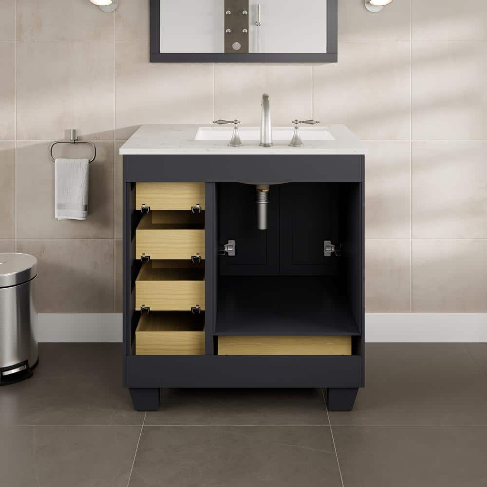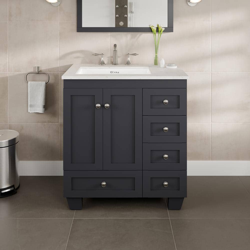 Elevate your bathroom's elegance with the Eviva Acclaim 30" Bath Vanity. Crafted from solid wood, this freestanding vanity combines a sleek dark gray finish with a luxurious white Carrara quartz top, exuding both contemporary style and timeless appeal. Perfect for professionals and DIY enthusiasts seeking quality and sophistication.