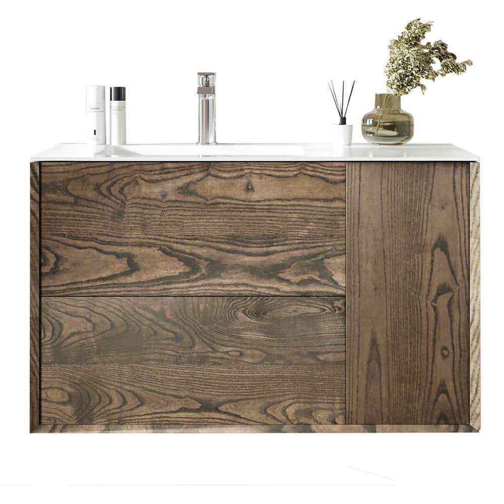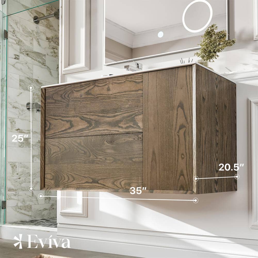 The Eviva Ciocco 35-inch bathroom vanity in Walnut enhances your space with its modern design and efficient function. Built with solid wood, it features a seamless white solid surface top with an integrated sink and offers ample storage with its intelligent drawer and shelf configuration, all made with the excellence of Spanish craftsmanship.