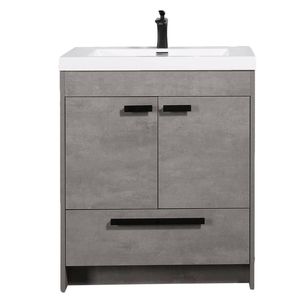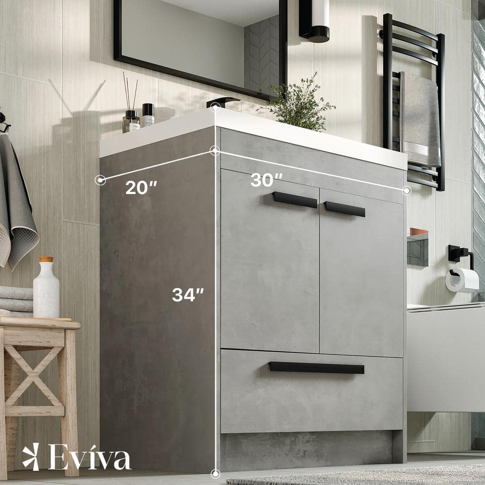 Upgrade your bathroom with the Eviva Lugano 30" Bath Vanity, featuring a sleek cement gray finish and a white acrylic top with integrated sink. Crafted for durability and modern style, this vanity offers convenient storage with soft-closing doors and a streamlined design that fits any space effortlessly.