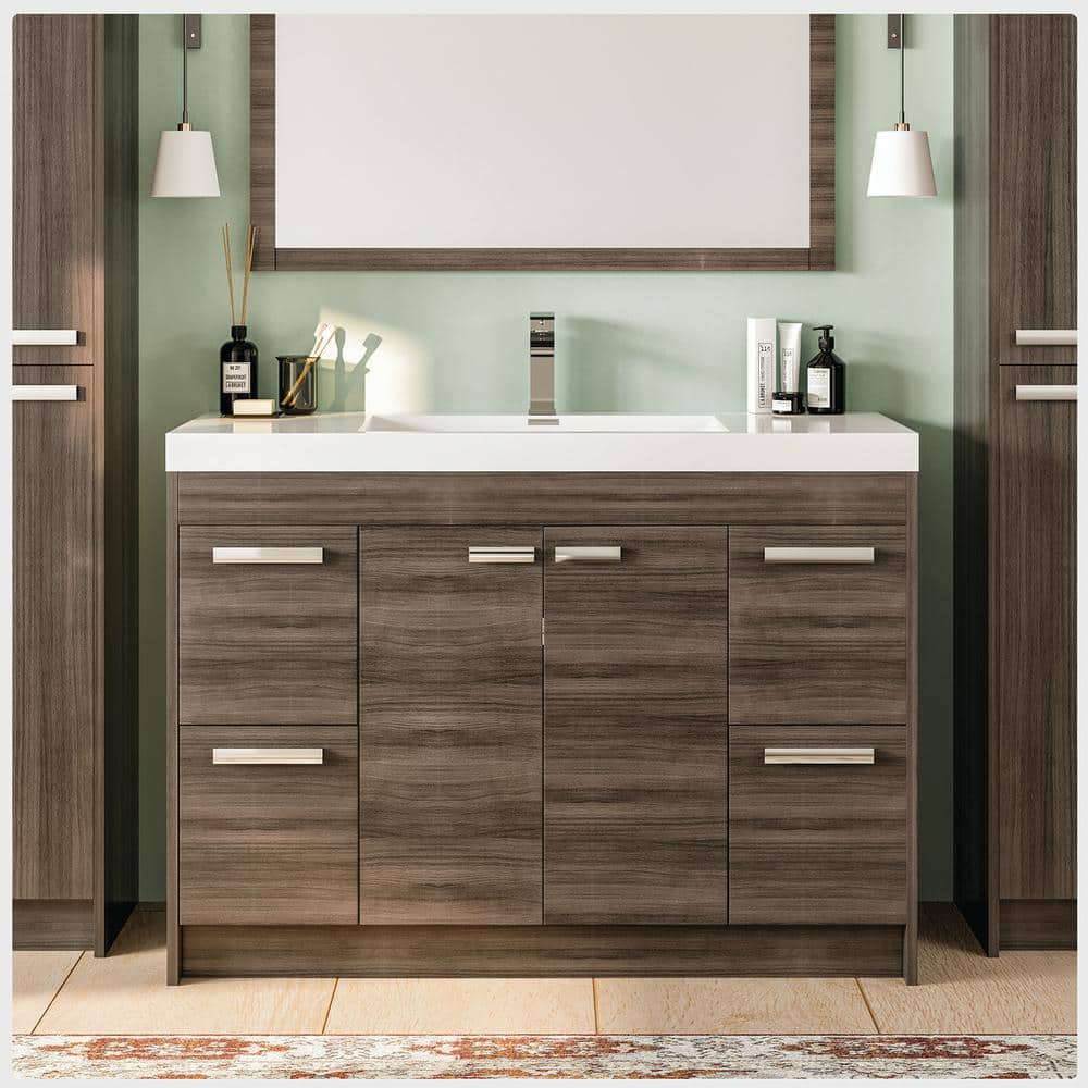 The Eviva Lugano 48-inch Bath Vanity in Gray Oak offers sleek, contemporary styling with a durable white acrylic top and integrated sink. Designed for modern living, it comes preassembled and features soft-closing drawers for a premium feel and convenience.