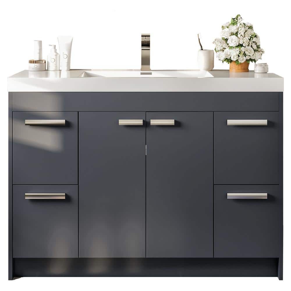 The Eviva Lugano 48-inch Bath Vanity in Gray is the epitome of modern elegance and practicality. Its sleek design, featuring a white acrylic integrated sink and soft-closing drawers, provides a seamless blend of style and function. Transform your bathroom space with this stunning centerpiece that requires minimal maintenance.