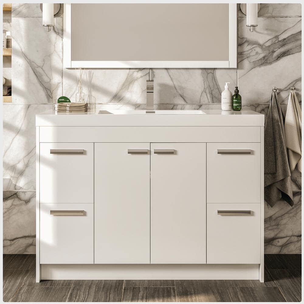 The Eviva Lugano 48" Single Bathroom Vanity combines sleek, modern design with functional craftsmanship. Its white acrylic top with an integrated sink delivers a sophisticated aesthetic and reliable performance, ideal for contemporary spaces. Enjoy the ease of soft-closing drawers and doors, coupled with minimal maintenance.