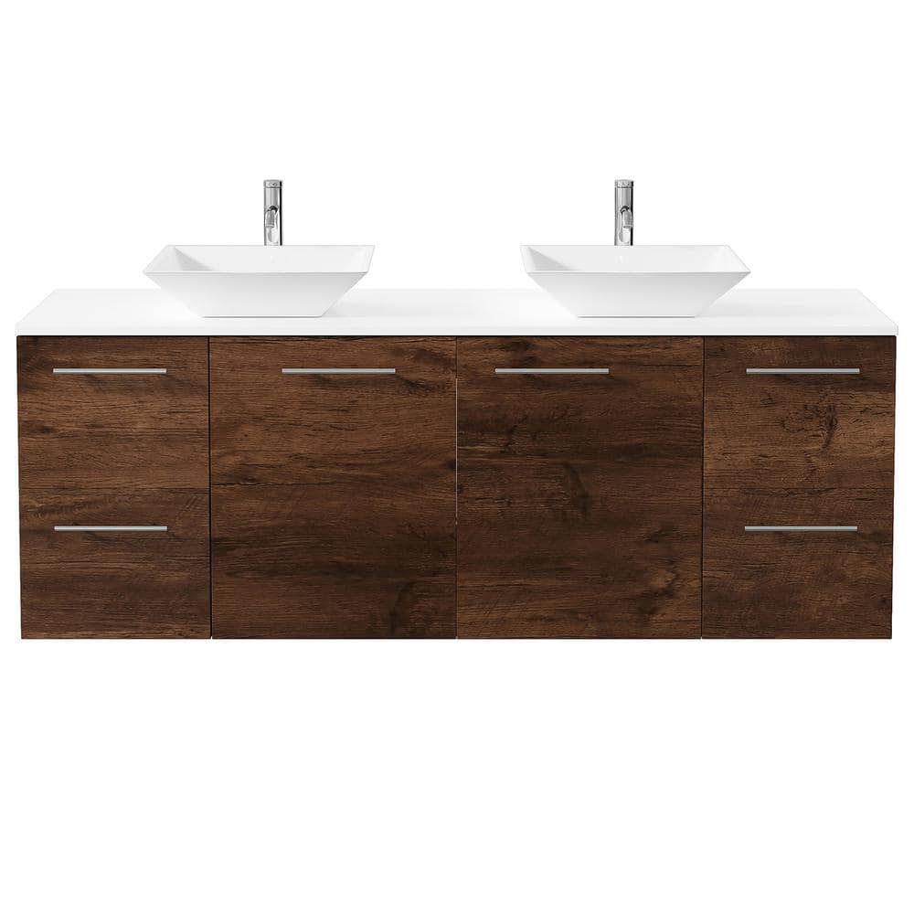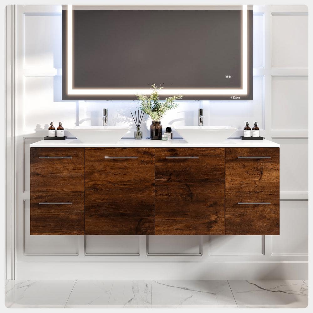 Eviva Luxurious 60 in. W x 22 in. D x 26 in. H Floating Bath Vanity in Rosewood with White Tempered Glass Top
